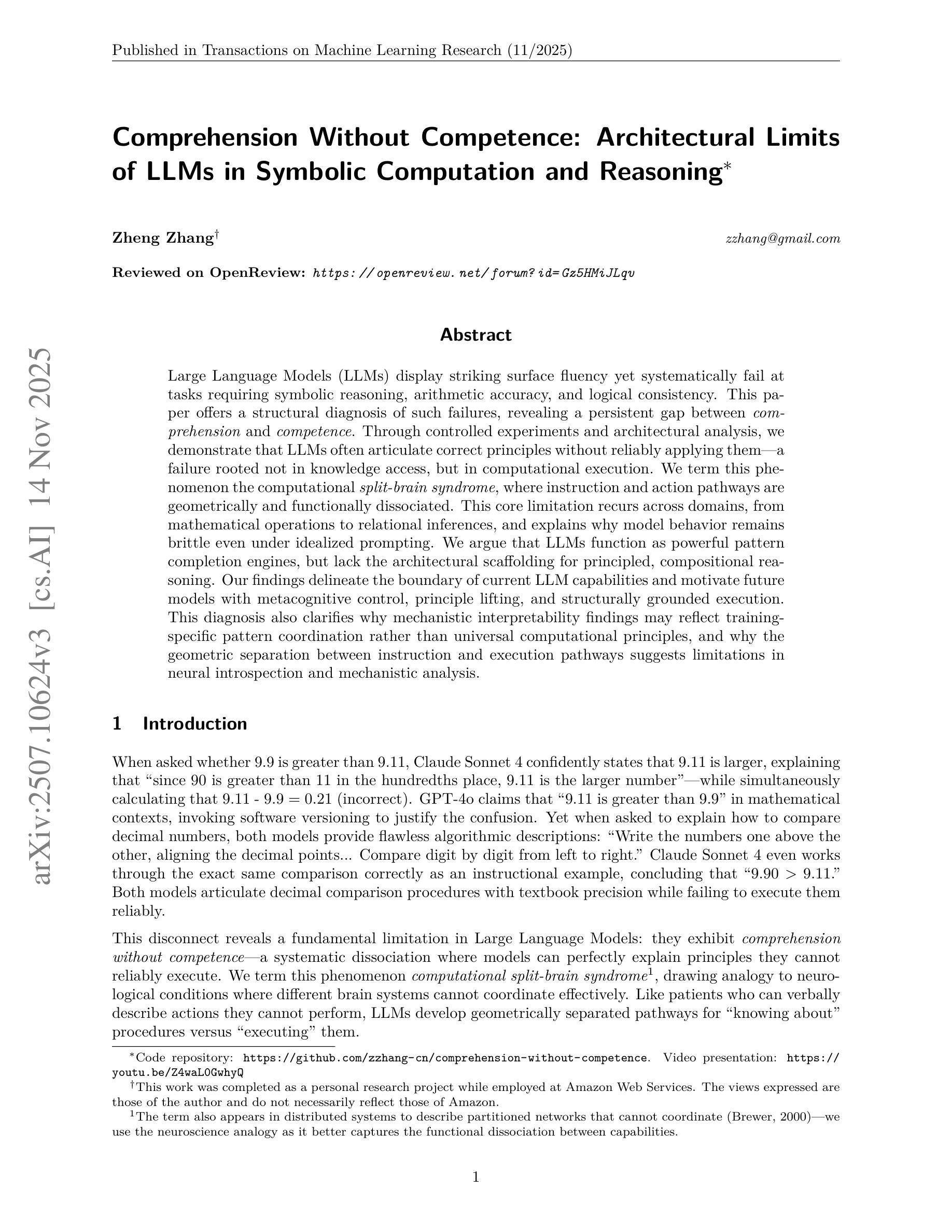本文指出大型语言模型(LLMs)虽然表现出令人惊叹的表面流畅度,但在需要符号推理、算术准确性和逻辑一致性的任务上却表现出系统性失败。文章对这类失败进行了结构性诊断,揭示了“理解”与“能力”之间的持久差距。通过控制实验和架构分析,文章展示了LLMs往往能够正确阐述原则,但在实际应用中却无法可靠地应用这些原则——这种失败并非源于知识获取,而是源于计算执行。这种现象被称为计算“裂脑综合征”,其中指令和执行路径在几何和功能上相互分离。这种核心限制在各个领域普遍存在,从数学运算到关系推理都是如此,并解释了为什么即使在理想化的提示下,模型行为仍然脆弱。文章强调LLMs作为强大的模式完成引擎的功能,但缺乏进行原则性、组合性推理的架构支撑。