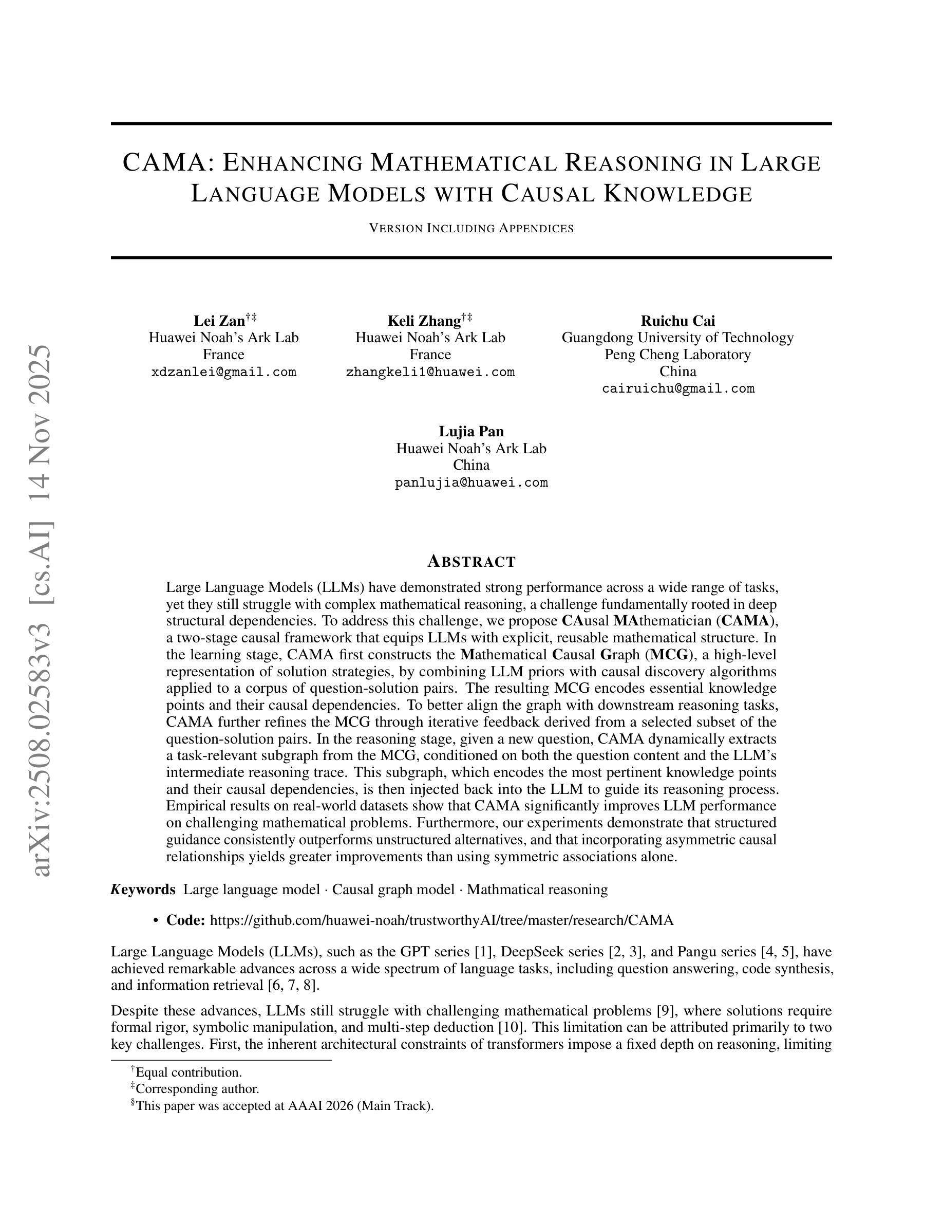 大型语言模型(LLM)在多种任务中表现出强大的性能,但在复杂的数学推理方面仍存在挑战。为解决这一挑战,提出了因果数学家(CAMA)框架,该框架分为两个阶段,为LLM提供了明确的可重复使用的数学结构。学习阶段构建数学因果图(MCG),通过结合LLM先验知识与因果发现算法,对问题解决方案对进行编码,形成高层次的解决方案策略表示。为了与下游推理任务更好地对齐,CAMA通过来自问题解决方案对的迭代反馈进一步改进了MCG。在推理阶段,对于新问题,CAMA根据问题和LLM的中间推理轨迹从MCG中提取相关子图,并将其注入LLM以指导其推理过程。实证结果表明,CAMA显著提高了LLM在挑战性数学问题上的性能。