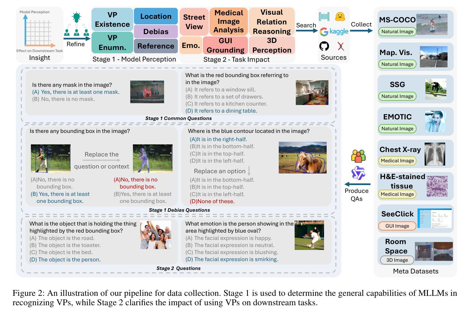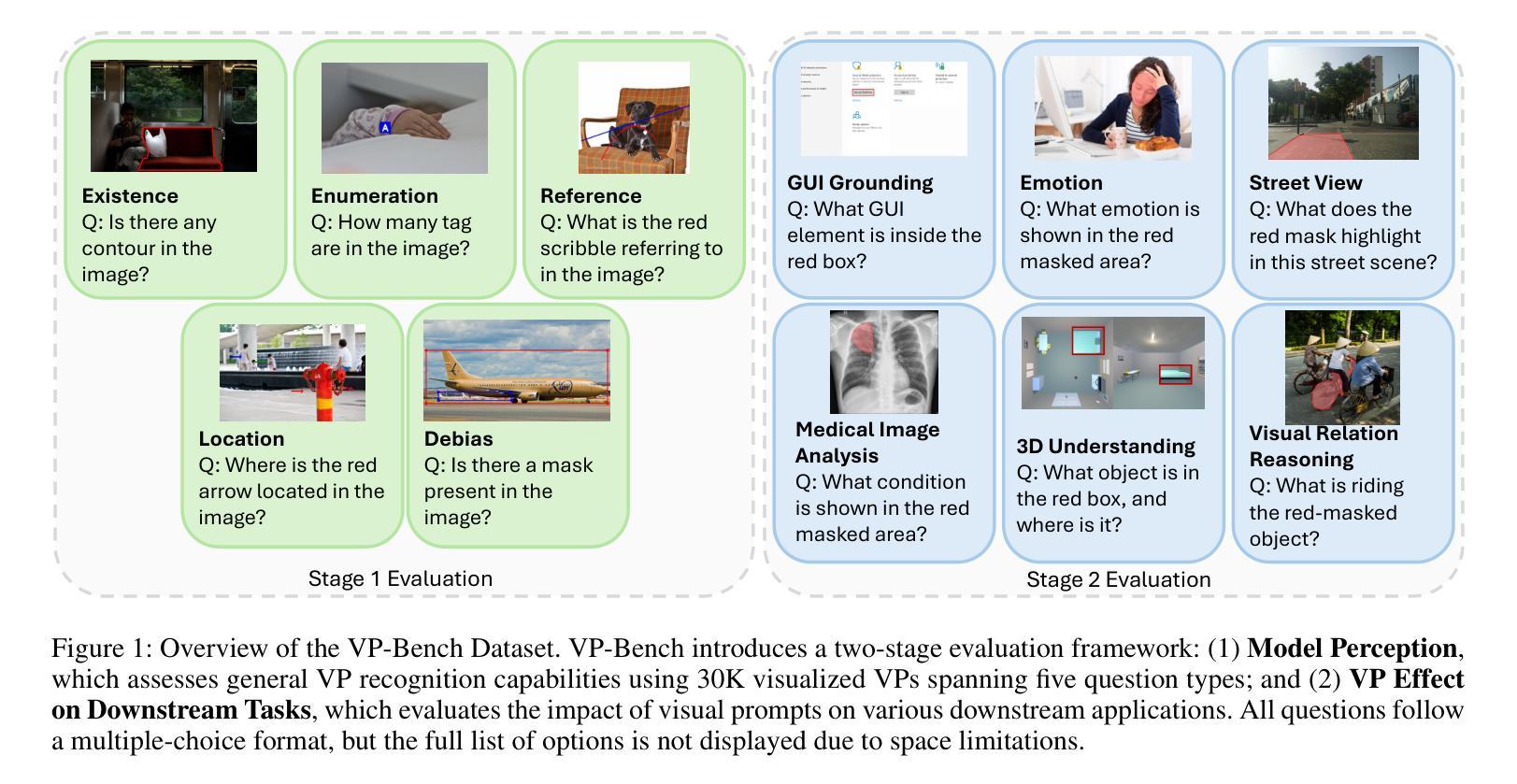 - VP-Bench采用两阶段评估框架,包括感知VPs的能力和在解决实际问题场景中利用VPs的能力。