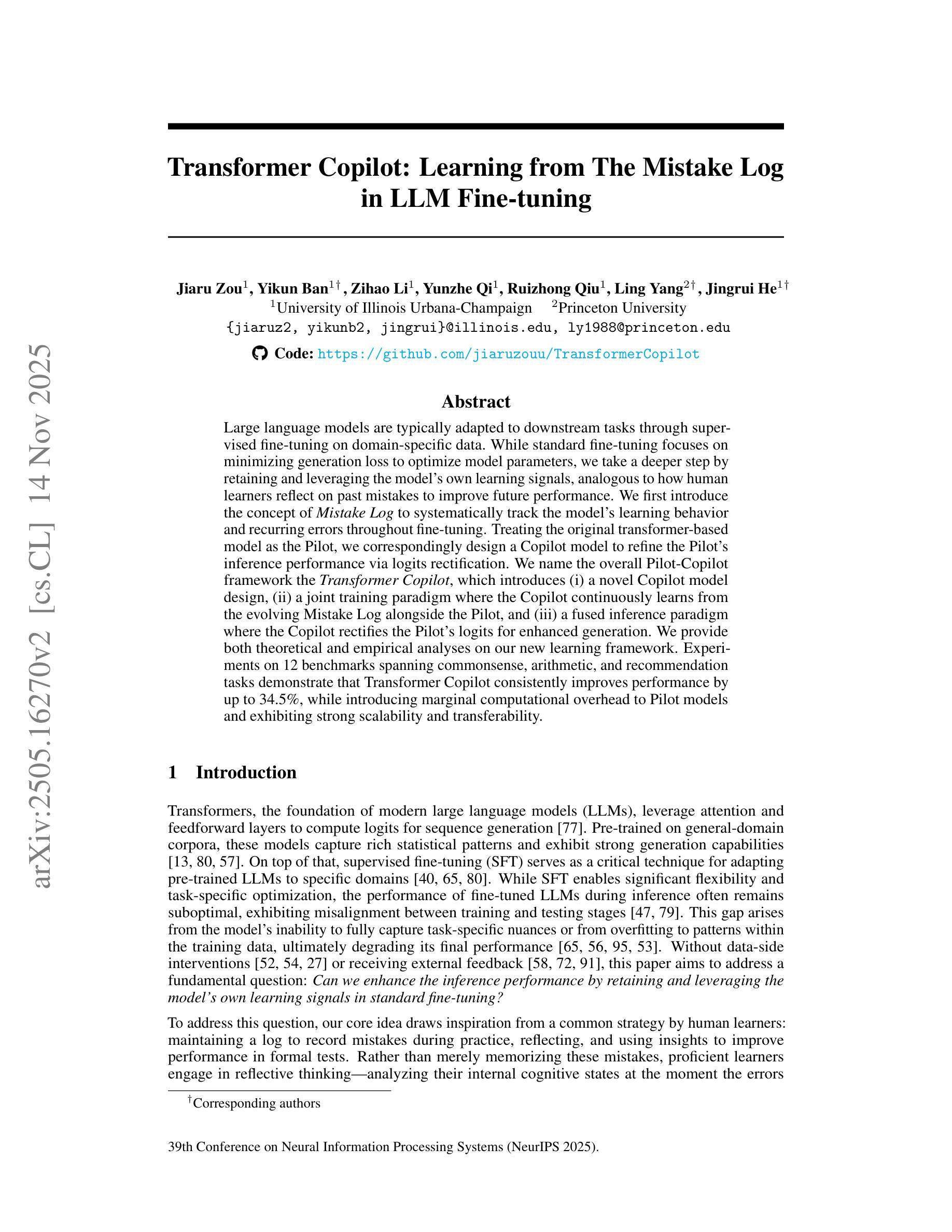 Large language models are typically adapted to downstream tasks through supervised fine-tuning on domain-specific data. While standard fine-tuning focuses on minimizing generation loss to optimize model parameters, we take a deeper step by retaining and leveraging the model’s own learning signals, analogous to how human learners reflect on past mistakes to improve future performance. We first introduce the concept of Mistake Log to systematically track the model’s learning behavior and recurring errors throughout fine-tuning. Treating the original transformer-based model as the Pilot, we correspondingly design a Copilot model to refine the Pilot’s inference performance via logits rectification. We name the overall Pilot-Copilot framework the Transformer Copilot, which introduces (i) a novel Copilot model design, (ii) a joint training paradigm where the Copilot continuously learns from the evolving Mistake Log alongside the Pilot, and (iii) a fused inference paradigm where the Copilot rectifies the Pilot’s logits for enhanced generation. We provide both theoretical and empirical analyses on our new learning framework. Experiments on 12 benchmarks spanning commonsense, arithmetic, and recommendation tasks demonstrate that Transformer Copilot consistently improves performance by up to 34.5%, while introducing marginal computational overhead to Pilot models and exhibiting strong scalability and transferability. Our code is released at https://github.com/jiaruzouu/TransformerCopilot.