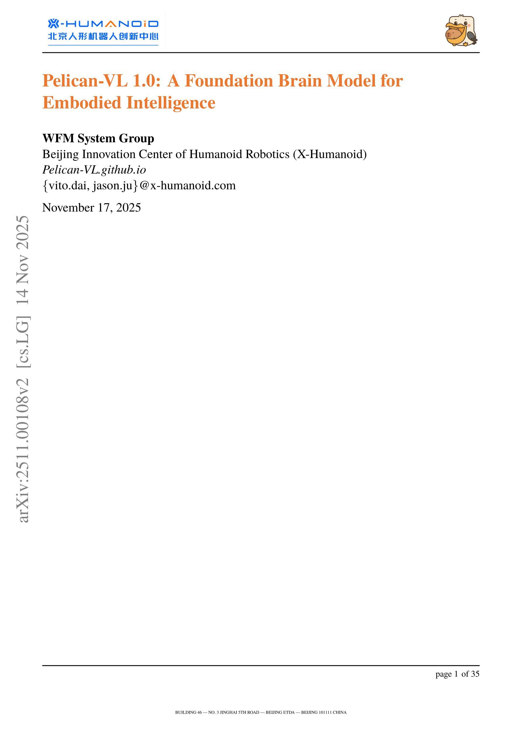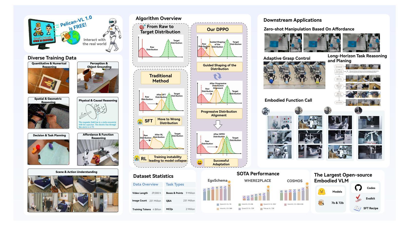 本文介绍了Pelican-VL 1.0,这是一个新的开源实体脑模型系列,参数规模从7亿到72亿不等。我们的明确使命是:将强大的智能嵌入各种实体。Pelican-VL 1.0目前是最大规模的开源实体多模态脑模型。它的核心优势在于深度整合数据能力和智能自适应学习机制。具体来说,metaloop从包含4亿多个标记的原始数据集中提炼出高质量数据集。Pelican-VL 1.0在由1000多个A800 GPU组成的大规模集群上进行训练,每个检查点消耗超过5万多个A800 GPU小时。这使其基础模型的性能提升了20.3%,并且相较于开源的百亿参数级别模型高出10.6%,在知名的实体基准测试中与领先的专有系统不相上下。我们建立了一个新的框架,DPPO(深思熟虑的策略优化政策),受人类元认知的启发来训练Pelican-VL 1.0。我们将其操作化为一个metaloop,让AI学会刻意练习,这是一个RL-精炼-诊断-SFT循环。