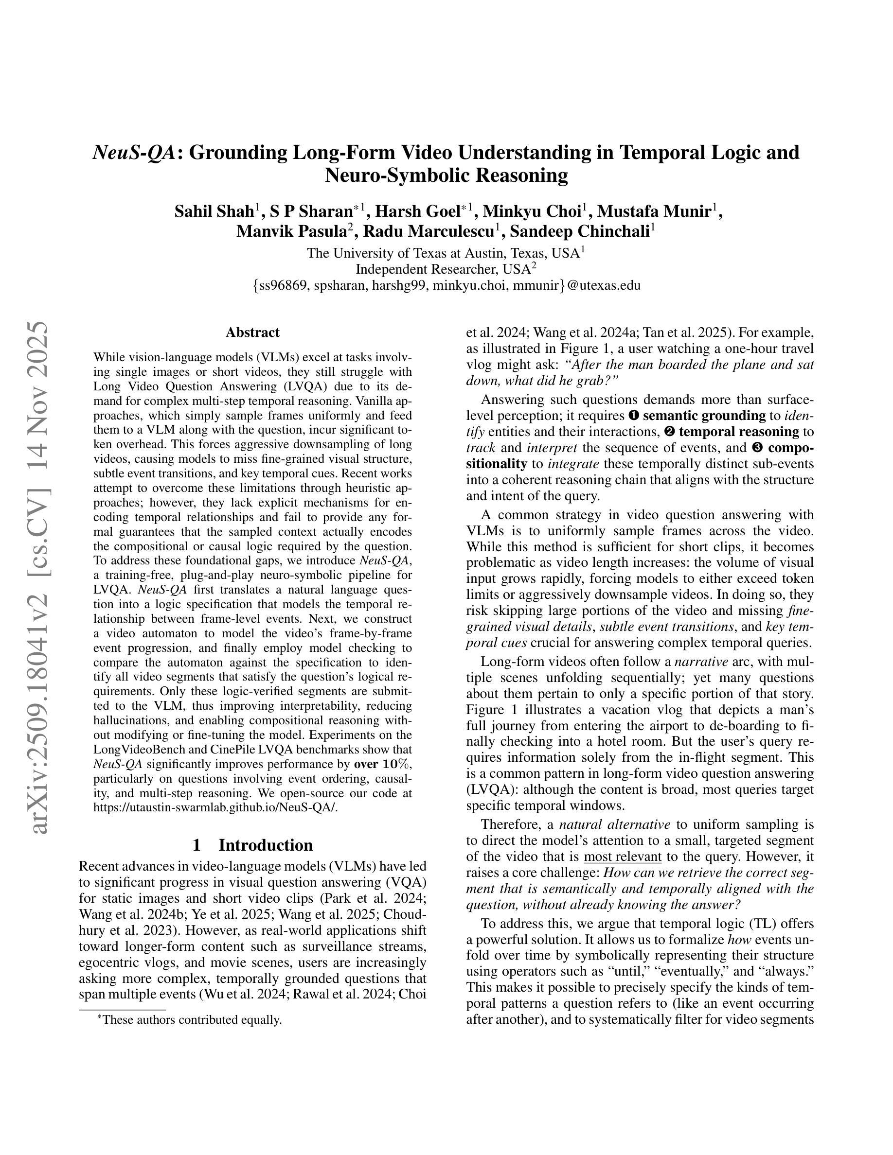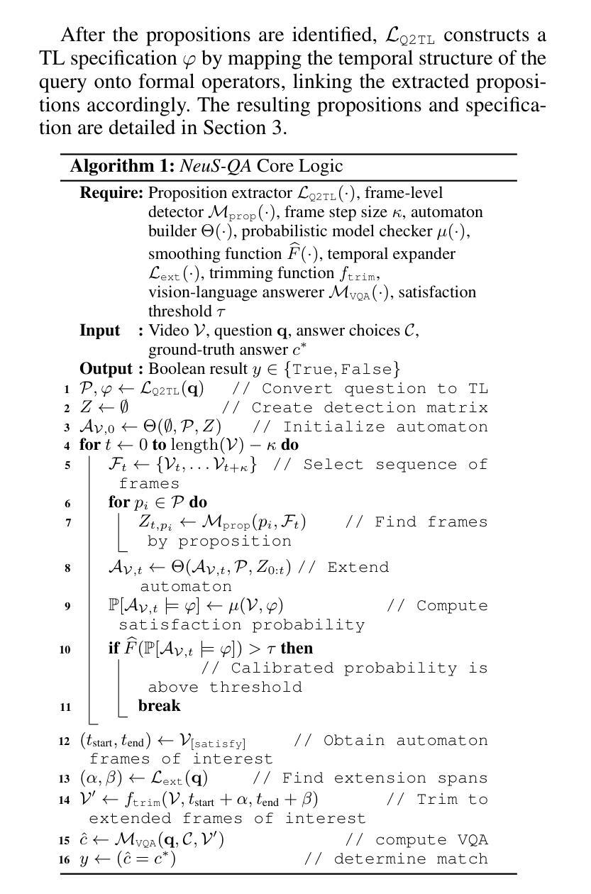 视觉语言模型(VLM)在涉及单张图片或短视频的任务上表现出色,但由于长视频问答(LVQA)需要复杂的多步时序推理,它们仍然面临挑战。传统的方法只是简单地均匀采样帧,并将其与问题一起输入到VLM中,这导致了大量的标记开销。这迫使人们对长视频进行激烈的下采样,导致模型错过精细的视觉效果、微妙的事件过渡和关键的时间线索。最近的工作试图通过启发式方法来克服这些限制,然而,它们缺乏明确的编码时间关系的机制,无法提供任何正式保证所采样的上下文实际上编码了问题所需的组合或因果逻辑。为了解决这些基础差距,我们引入了NeuS-QA,这是一个用于LVQA的无需训练、即插即用的神经符号管道。NeuS-QA首先将自然语言问题翻译成逻辑规范,该规范模拟帧级别事件之间的时间关系。接下来,我们构建了一个视频自动机来模拟视频逐帧的事件进展,并最终采用模型检查来比较自动机与规范,以识别满足问题逻辑要求的所有视频片段。只有这些经过逻辑验证的片段才被提交给VLM,从而提高了可解释性,减少了幻觉,并能够在不修改或微调模型的情况下进行组合推理。在LongVideoBench和CinePile LVQA基准测试上的实验表明,NeuS-QA的性能提高了10%以上,特别是在涉及事件顺序、因果关系和多步推理的问题上。我们的代码已开源在https://utaustin-swarmlab.github.io/NeuS-QA/。