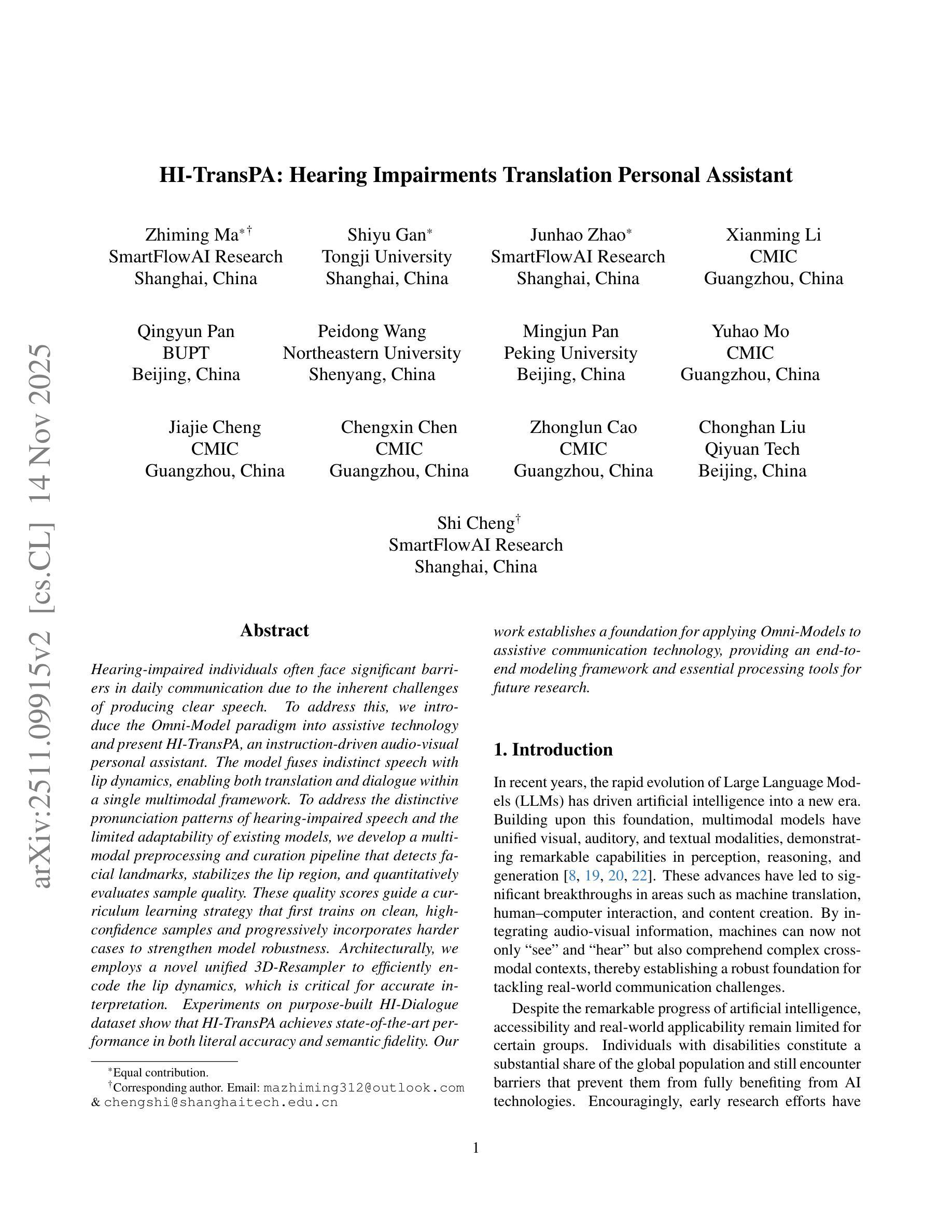 Omni-Model范式被引入助听技术中,并推出了HI-TransPA,这是一款指令驱动的视听个人助理。该技术融合了不清晰语音与唇部动态,在一个单一的多模式框架内实现翻译和对话。针对听力受损者的独特发音模式和现有模型的有限适应性,开发了一个多模式预处理和筛选管道,用于检测面部地标、稳定唇部区域并定量评估样本质量。实验表明,HI-TransPA在字面准确性和语义忠实度方面达到了最新技术水平。