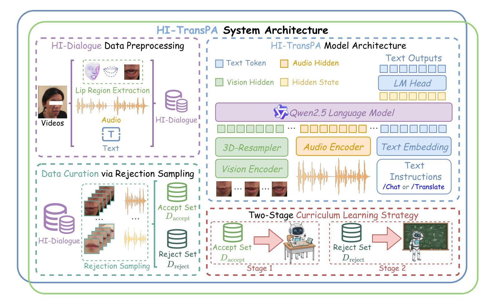 听力受损人士在日常沟通中常因发音清晰度的问题面临重大障碍。为解决这一问题,我们将Omni-Model范式引入辅助技术,并推出HI-TransPA——一款指令驱动的视听个人助理。该模型融合了模糊不清的语音和唇部动态,在单一的多模式框架内实现翻译和对话。针对听力受损人士的发音特点和现有模型的适应性问题,我们开发了一种多模式预处理和筛选管道,可以检测面部地标、稳定唇部区域,并定量评估样本质量。这些质量分数引导了一种先学习简单、高信心样本,再逐步引入更困难案例的教学策略,以加强模型的稳健性。在结构上,我们采用了一种新颖的统一3D重采样器来有效编码唇部动态,这对准确解读至关重要。在针对特定目的构建的HI-Dialogue数据集上的实验表明,HI-TransPA在字面准确性和语义保真度方面都达到了最先进的性能。我们的工作奠定了将Omni-Models应用于辅助通信技术的基础,为未来的研究提供了端到端的建模框架和必要的处理工具。