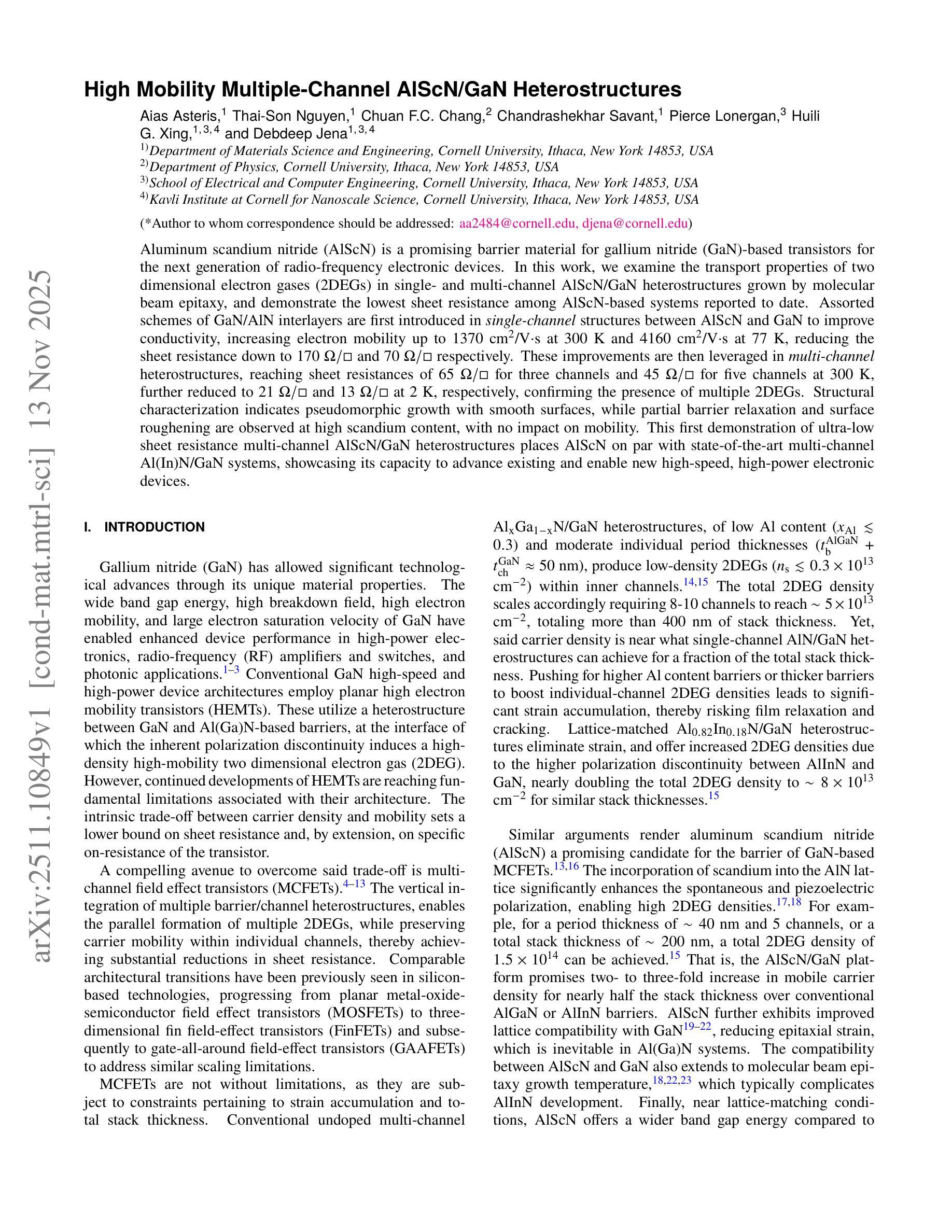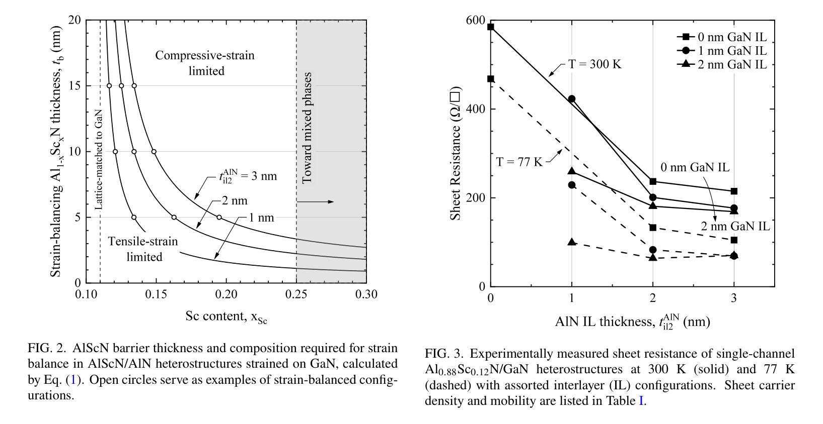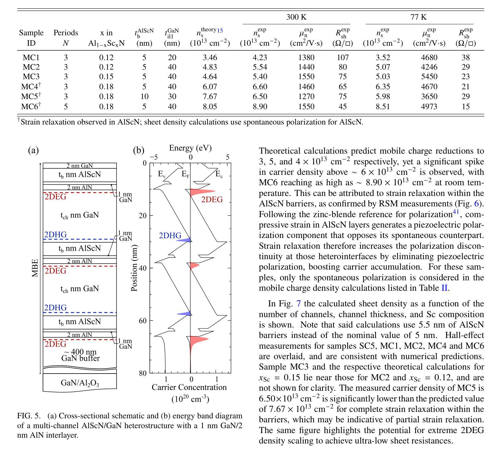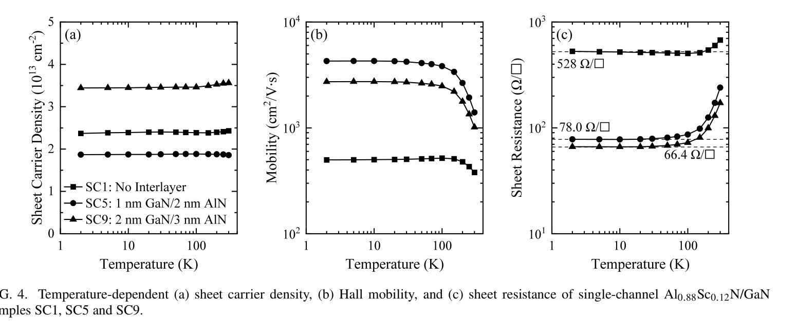 - 研究了单通道和多通道AlScN/GaN异质结构的二维电子气传输特性。