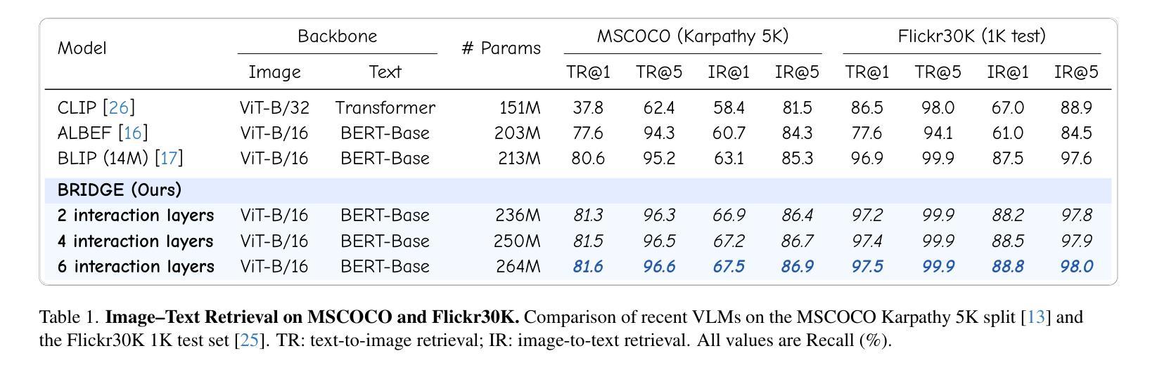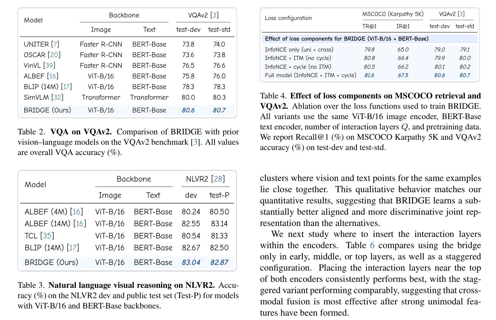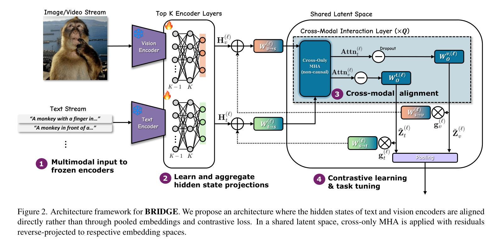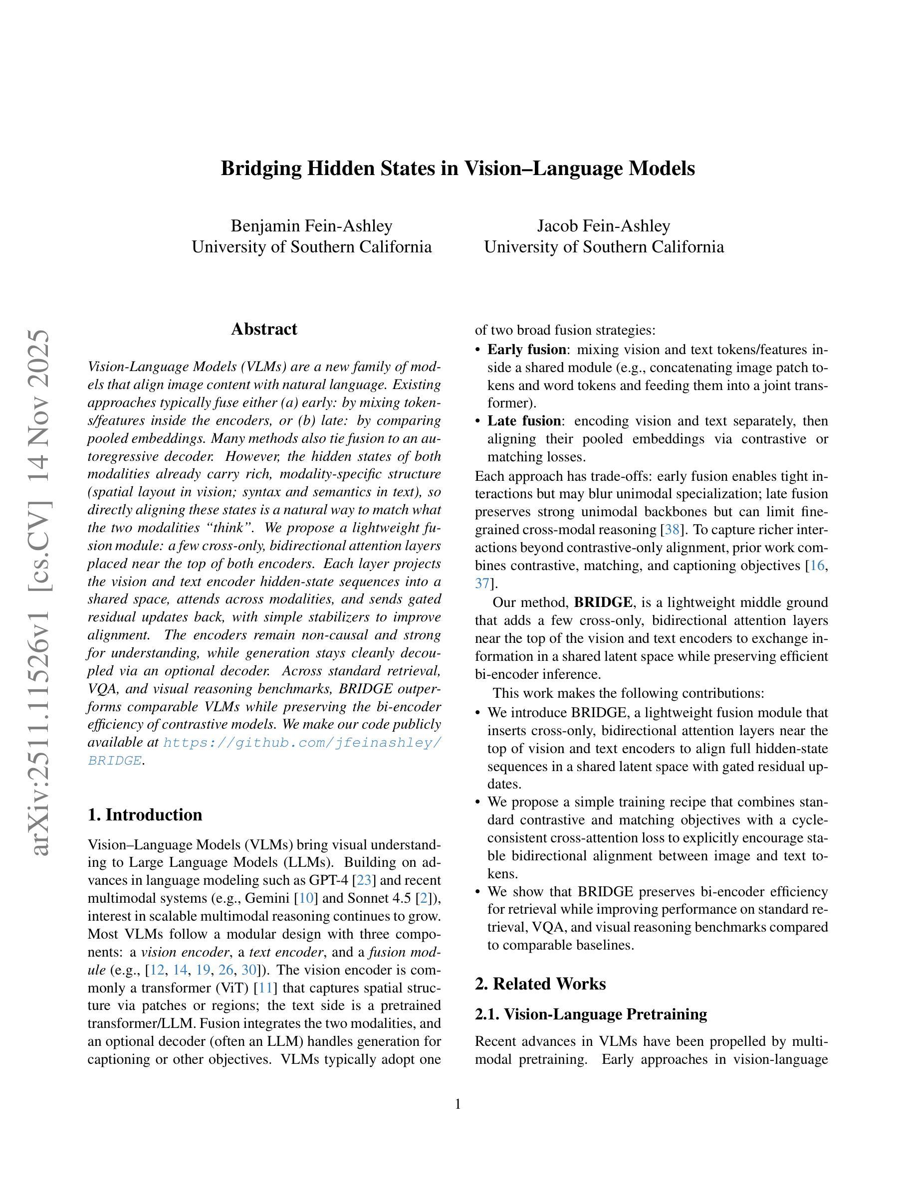 视觉语言模型(VLMs)是一类新的模型,能够将图像内容与自然语言相结合。现有的方法通常融合(a)早期:通过在编码器内部混合令牌/特征,或(b)后期:通过比较池化嵌入。许多方法还将融合与自回归解码器相关联。然而,两种模式的隐藏状态已经携带了丰富且特定的模式结构(视觉中的空间布局;文本中的语法和语义),因此直接对齐这些状态是匹配两种模式“思考”内容的一种自然方式。我们提出了一种轻量级的融合模块:在两种编码器的顶部附近放置几个仅交叉的双向注意层。每层都将视觉和文本编码器隐藏状态序列投射到共享空间,跨模态注意,并通过简单的稳定器发送门控残差更新以改善对齐。编码器保持非因果性并增强理解能力,而生成则通过可选的解码器保持清晰解耦。在标准检索、视觉问答和视觉推理基准测试中,BRIDGE优于类似的VLMs,同时保留了对比模型的双向编码器效率。我们在https://github.com/jfeinashley/BRIDGE公开我们的代码。