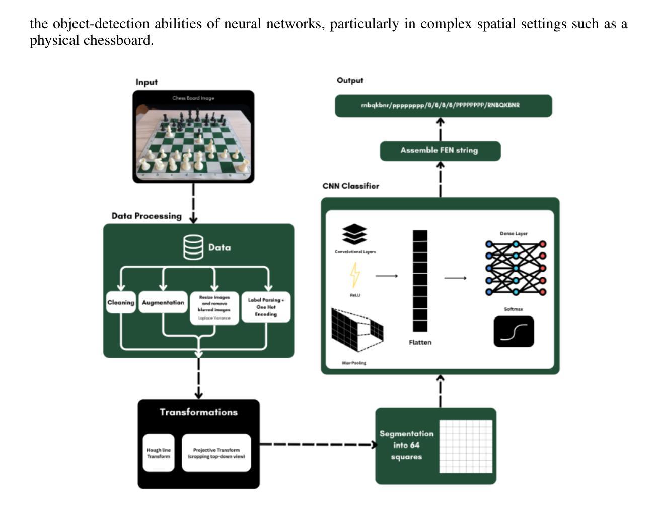 - CVChess系统通过深度学习将棋盘图像转换为FEN记号法。