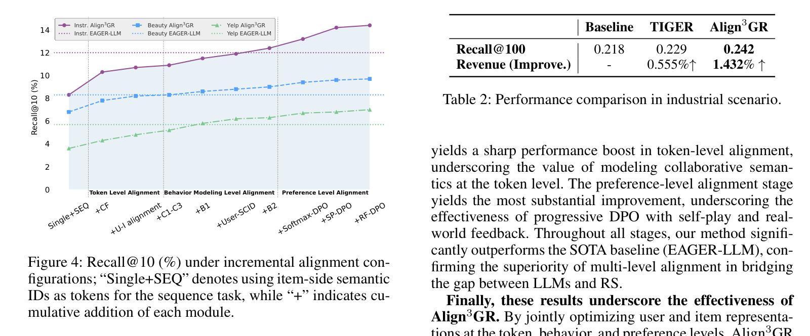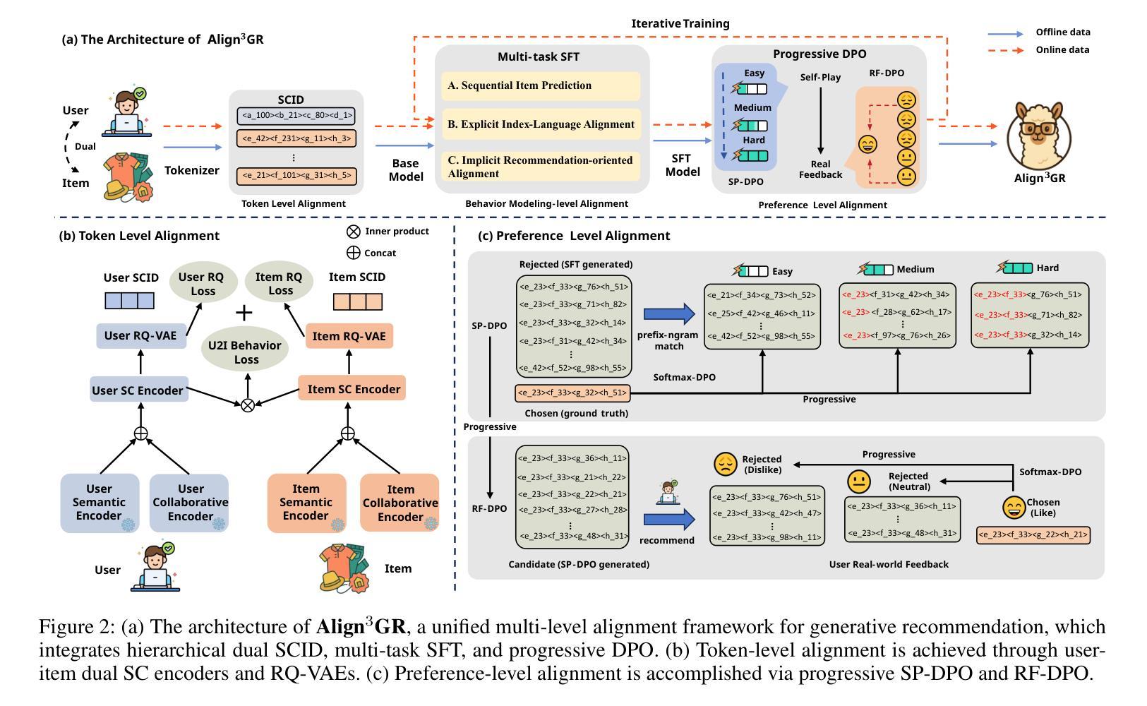 大型语言模型(LLMs)在利用结构化世界知识和多步推理能力方面显示出显著优势。然而,将LLMs转化为现实世界的推荐系统时,由于语义和行为的不对齐,会出现基本挑战。为了弥补这一差距,我们提出了Align$^3$GR,这是一种统一标记层、行为建模层和偏好层对齐的新型框架。我们的方法引入了:融合用户项目语义和协同信号的双重标记。通过双向语义对齐增强行为建模。结合自玩(SP-DPO)和现实世界反馈(RF-DPO)的渐进式DPO策略,用于动态偏好适应。实验表明,在公开数据集上,Align$^3$GR的Recall@10指标优于最新技术基线+17.8%,NDCG@10指标优于+20.2%。在线A/B测试和大型工业推荐平台的全面部署也取得了显著成果。