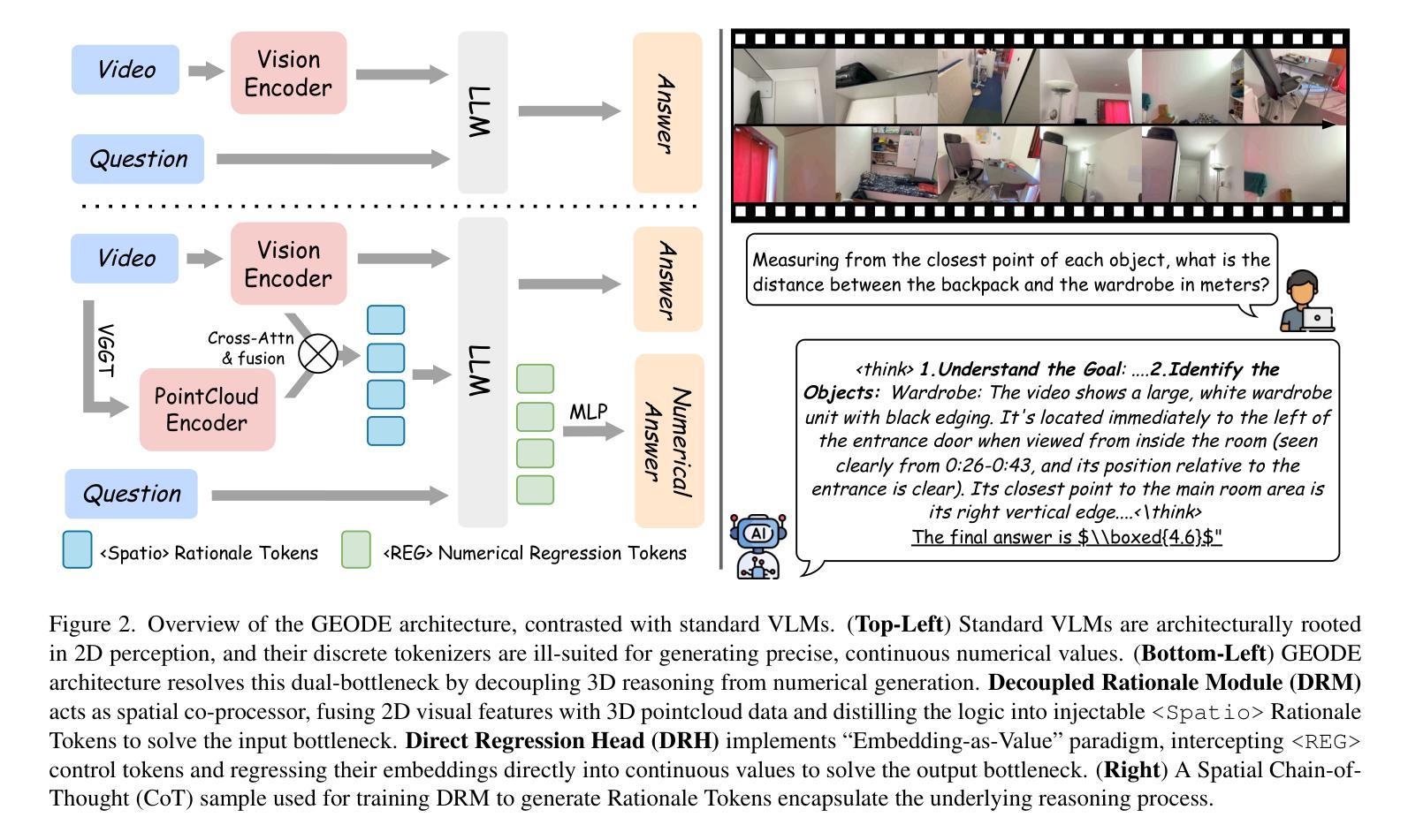 现有的视觉语言模型(VLMs)在架构上根植于“平面”感知,在理解真实世界的三维空间智能时存在根本性的困难。这种失败源于双重瓶颈:输入阶段的冲突,即计算昂贵的几何感知编码器和浅层的仅二维特征之间的冲突;以及输出阶段的不对齐,即离散的分词器在结构上无法生成精确、连续的数字值。为了打破这一僵局,我们引入了GEODE(几何输出和解耦输入引擎)这一新型架构,它通过解耦三维推理和数值生成来解决这一双重瓶颈。GEODE增强主VLM两个专业、即插即用的模块:解耦理由模块(DRM)作为空间协处理器,通过交叉注意力将显式三维数据与二维视觉特征对齐,并将空间思维链逻辑提炼成可注入的理由令牌;以及直接回归头(DRH),这是一种“嵌入即值”的模式,它将专用控制令牌路由到轻量级多层感知器,进行精确、连续的标量回归和三维边界框。这些模块的协同作用使得我们的1.5B参数模型能够作为高级语义调度器发挥作用,实现了卓越的空间推理性能,与7B+模型相匹敌。