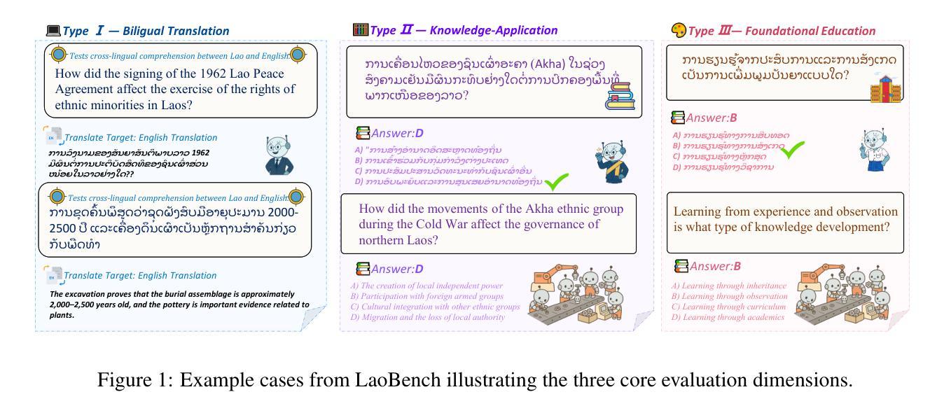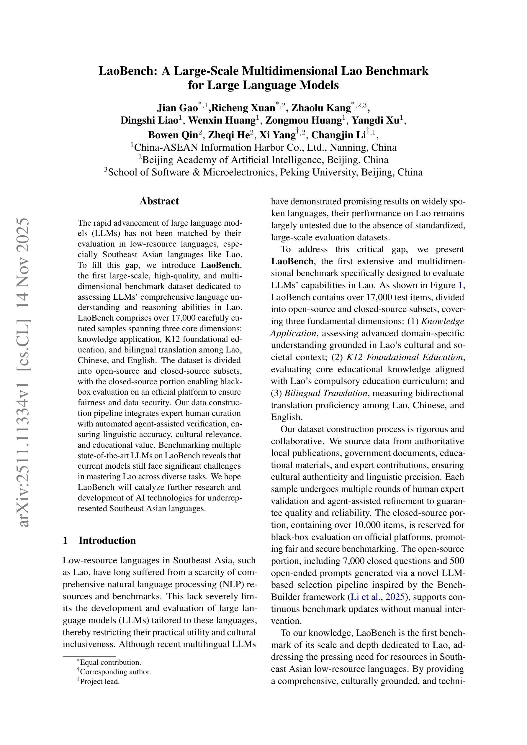 大型语言模型(LLM)的快速发展并未在资源匮乏的语言(尤其是东南亚语言如老挝语)的评估中得到相应的匹配。为了填补这一空白,我们推出了老挝语基准测试集(LaoBench)。它是首个大规模、高质量、多维度的基准测试集,专门用于评估LLM在老挝语的综合语言理解和推理能力。LaoBench包含超过17,000个精心挑选的样本,涵盖三个核心维度:知识应用、K-12基础教育以及老挝语、中文和英文之间的双语翻译。该数据集分为开源和闭源子集,闭源部分可以在官方平台上进行黑盒评估,以确保公平和数据安全。我们的数据构建流程融合了专家人工审核和自动化代理辅助验证,确保语言准确性、文化相关性和教育价值。在LaoBench上对多个最先进的大型语言模型进行基准测试表明,当前模型在掌握老挝语方面仍然面临重大挑战。我们希望LaoBench能推动对代表性不足的东南亚语言的人工智能技术的进一步研究和开发。