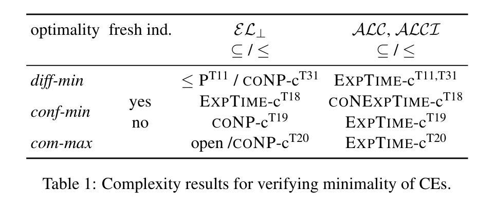 - 分析了不同对比解释变体在不同最优标准下的计算复杂性。