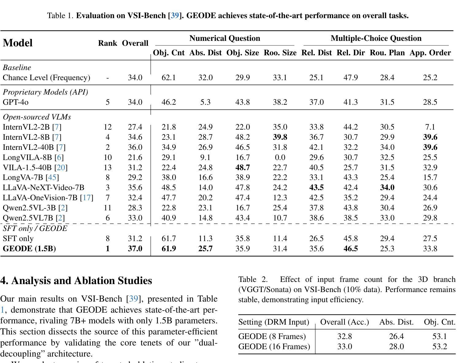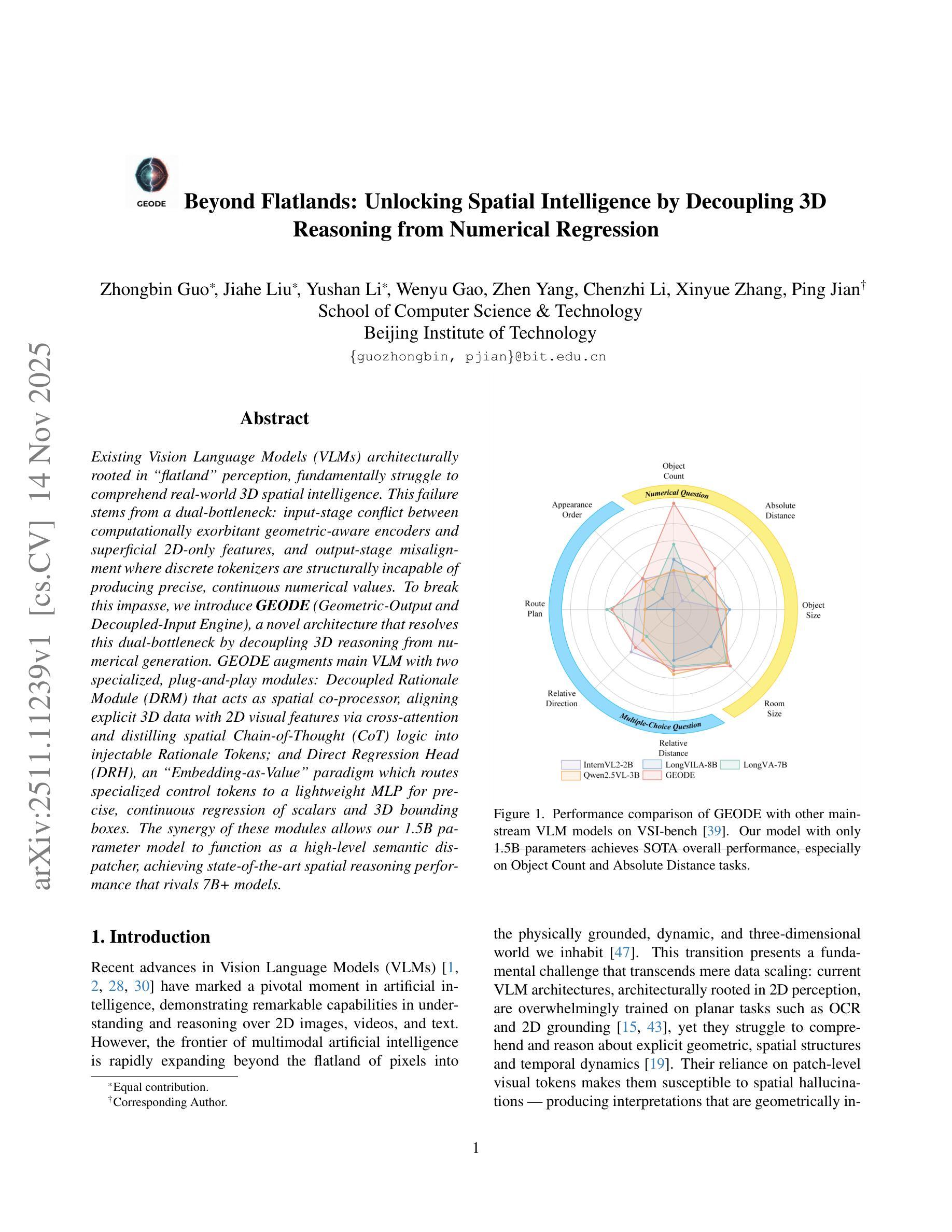 该文本主要讨论了现有视觉语言模型(VLMs)在理解真实世界3D空间智能方面的根本性挑战,并提出了一个新的架构GEODE来解决这个问题。GEODE通过解耦3D推理和数值生成,使用两个专用模块——解耦理性模块(DRM)和直接回归头(DRH)来提升VLMs的性能。该架构实现了对3D空间的理解,并达到了先进的空间推理性能。