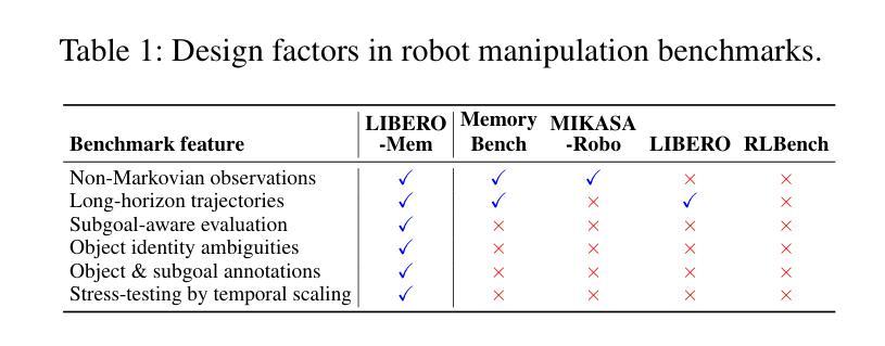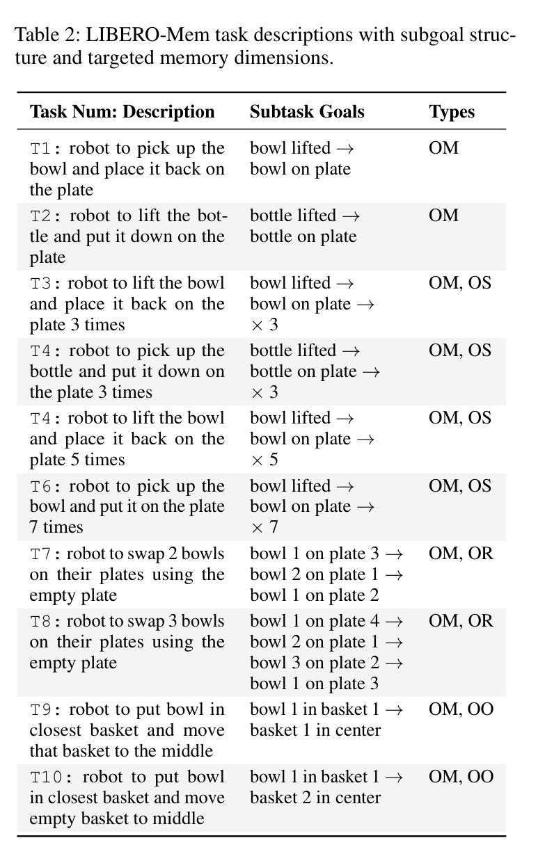 - LIBERO-Mem是一个非马尔可夫任务套件,旨在应对在对象层面部分可观察性下的机器人操作挑战。