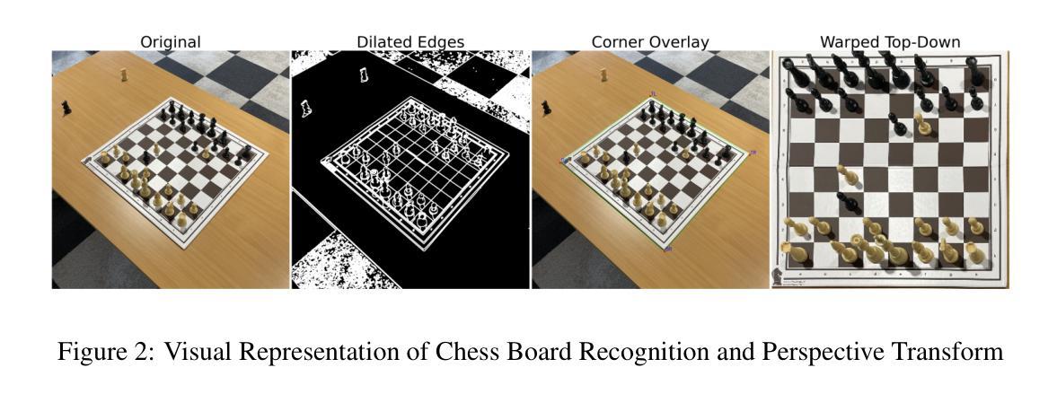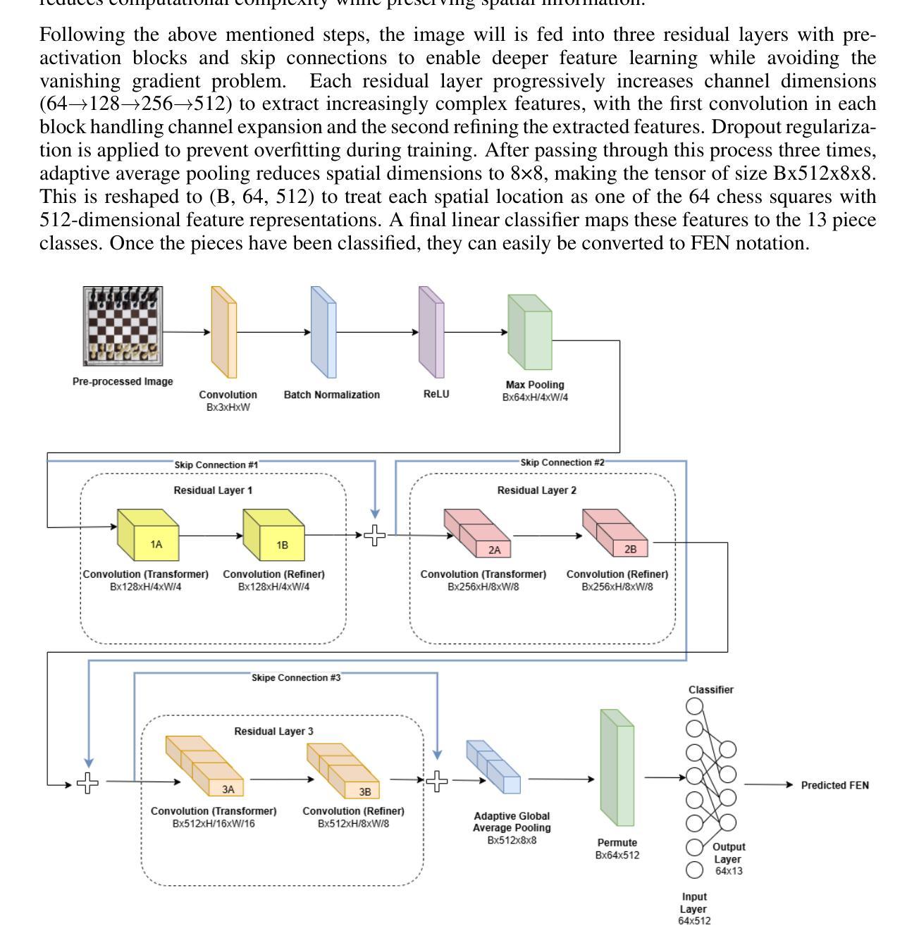 象棋由于在线学习平台的易访问性而在疫情期间观众人数大幅增加。然而,目前尚未有针对实体象棋游戏的相应辅助工具,这造成了模拟与数字象棋体验之间的鸿沟。本文介绍了CVChess,一个深度学习框架,可将象棋棋盘图像转换为Forsyth-Edwards记号法(FEN),然后输入到在线象棋引擎中,为你提供最佳的下一步行动建议。我们的方法采用带有残差层的卷积神经网络(CNN)来执行从智能手机摄像头图像中识别棋子的任务。该系统通过多步骤处理RGB格式的实体象棋棋盘图像:使用霍夫线变换进行边缘检测的图像预处理,以实现从上到下的棋盘对齐的投影变换,将棋盘分割成64个单独的方格,并使用残差CNN将棋子分类为13类(6种独特的白棋子和黑棋子,以及一个空方格)。残差连接有助于保留低级别的视觉特征,同时实现更深的特征提取,从而在训练过程中提高准确性和稳定性。我们使用包含10800张在多种照明条件和角度下拍摄的标注智能手机图像的象棋识别数据集(ChessReD)来训练和评估我们的模型。所得的分类结果编码为FEN字符串,可以输入到象棋引擎中,生成最优质的行动建议。