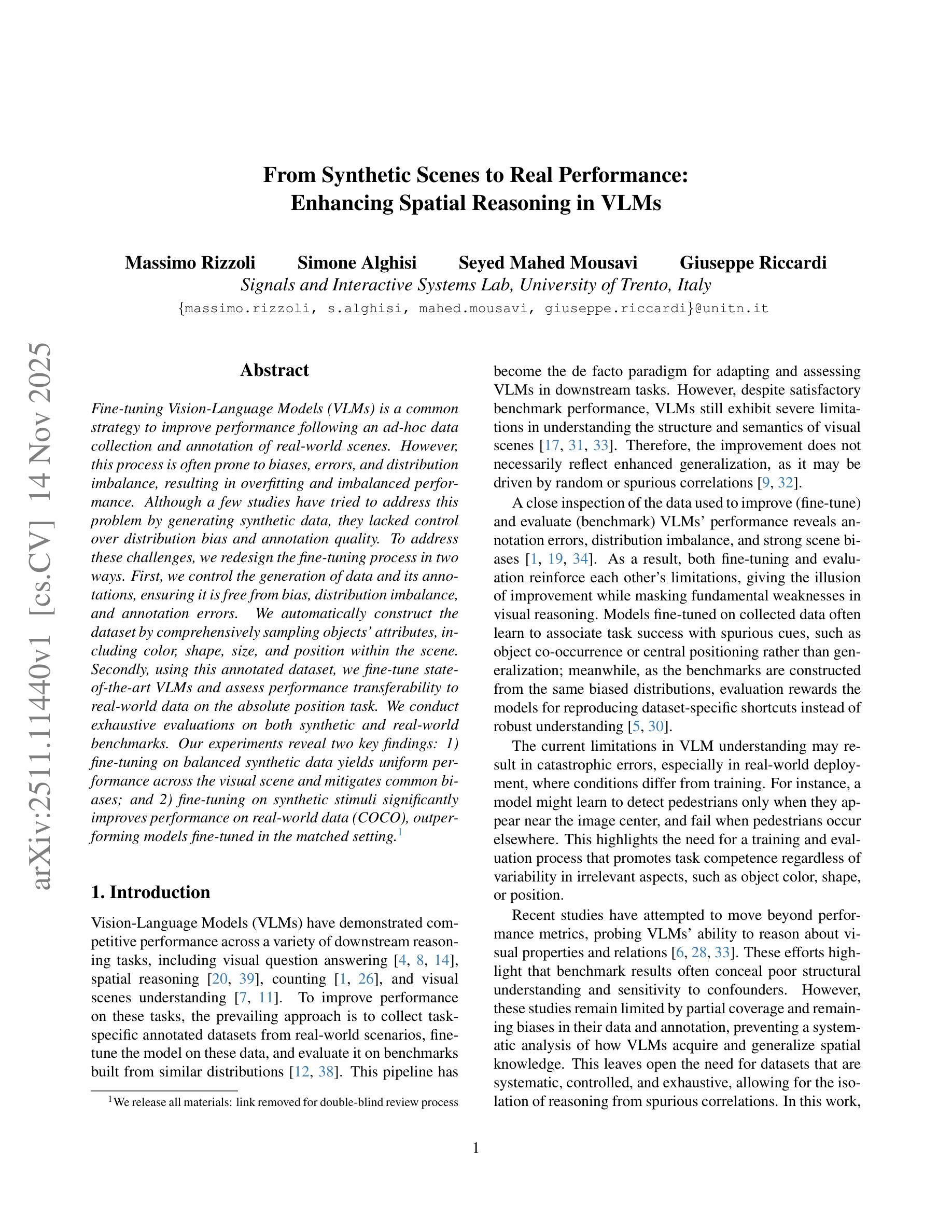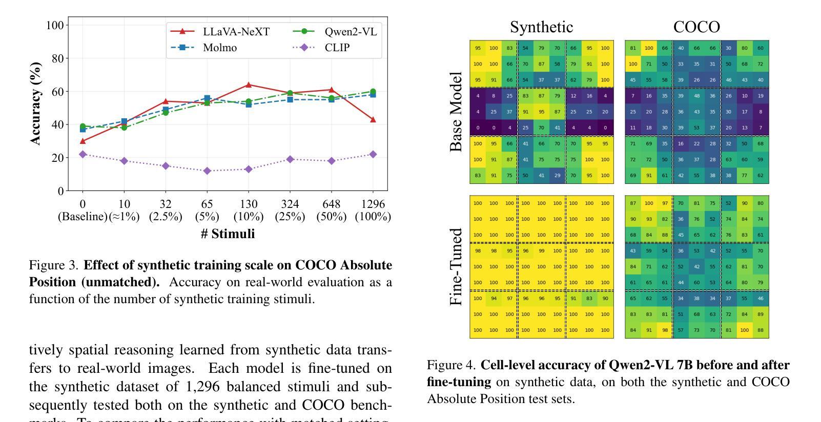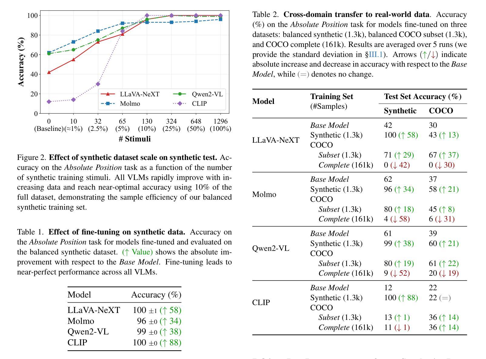 微调视觉语言模型(VLMs)是一种常见的策略,用于在收集特定数据并标注真实场景之后提高性能。然而,这个过程往往容易受到偏见、错误和分布不平衡的影响,导致过度拟合和性能不平衡。尽管有一些研究试图通过生成合成数据来解决这个问题,但它们对分布偏见和标注质量缺乏控制。为了解决这些挑战,我们以两种方式重新设计微调过程。首先,我们控制数据的生成及其注释,确保它不受偏见、分布不平衡和注释错误的影响。我们通过全面采样场景中物体的属性(包括颜色、形状、大小和位置)来自动构建数据集。其次,使用这个标注数据集,我们对最先进的VLMs进行微调,并评估在绝对位置任务上转移到真实世界数据的性能。我们在合成和真实世界的基准测试上都进行了详尽的评估。我们的实验揭示了两个关键发现:1)在平衡的合成数据上进行微调可以在视觉场景上产生统一的性能,并减轻常见的偏见;2)与在匹配环境中进行微调的模型相比,在合成刺激上进行微调显著提高了在真实世界数据(COCO)上的性能。