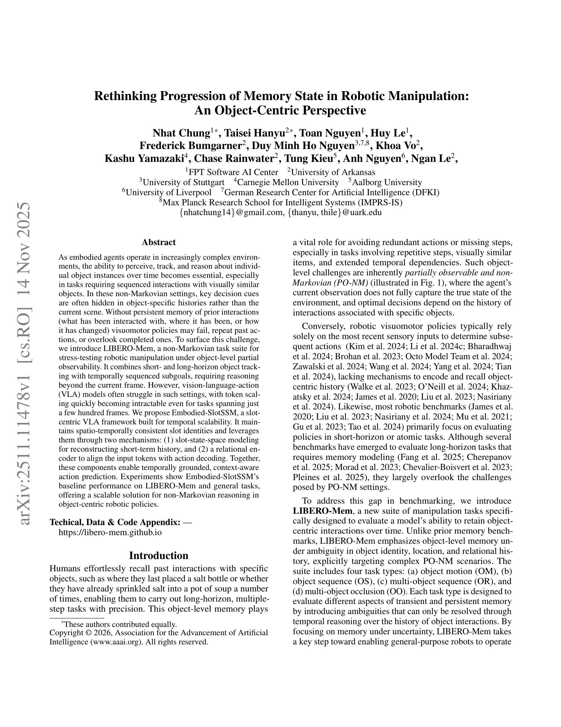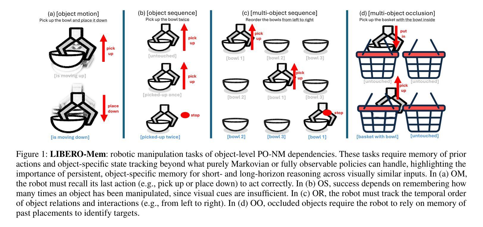 本文介绍了在日益复杂的环境中,对于个体对象实例的感知、追踪和时间推理能力的重要性。特别是在需要序列化与视觉相似对象交互的任务中,关键决策线索通常隐藏在特定对象的历史中而非当前场景中。缺乏先前交互的持久记忆可能导致视觉运动策略失败、重复过去的行动或忽视已完成的行动。为应对这一挑战,本文引入了LIBERO-Mem,一个非马尔可夫任务套件,用于测试在对象层面部分可观察性下的机器人操作。它结合了短期和长期对象跟踪以及时间序列子目标,需要超越当前框架的推理。然而,在这种设置中,视觉语言动作(VLA)模型通常表现挣扎,即使在只涉及数百帧的任务中,符号扩展也变得迅速不可行。本文提出了Embodied-SlotSSM,一个针对时间可扩展性的槽位中心VLA框架。它保持时空一致的槽位身份,并通过两种机制利用它们:(1)槽位状态空间建模以重建短期历史,(2)关系编码器以与行动解码对齐输入符号。这些组件共同实现了时间上的、上下文感知的行动预测。
