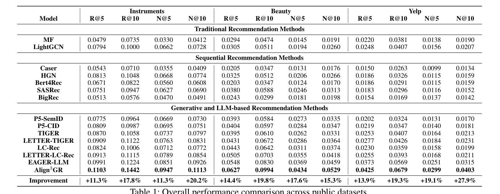 - Align$^3$GR框架通过统一令牌级、行为建模级和偏好级的对齐来解决这个问题。