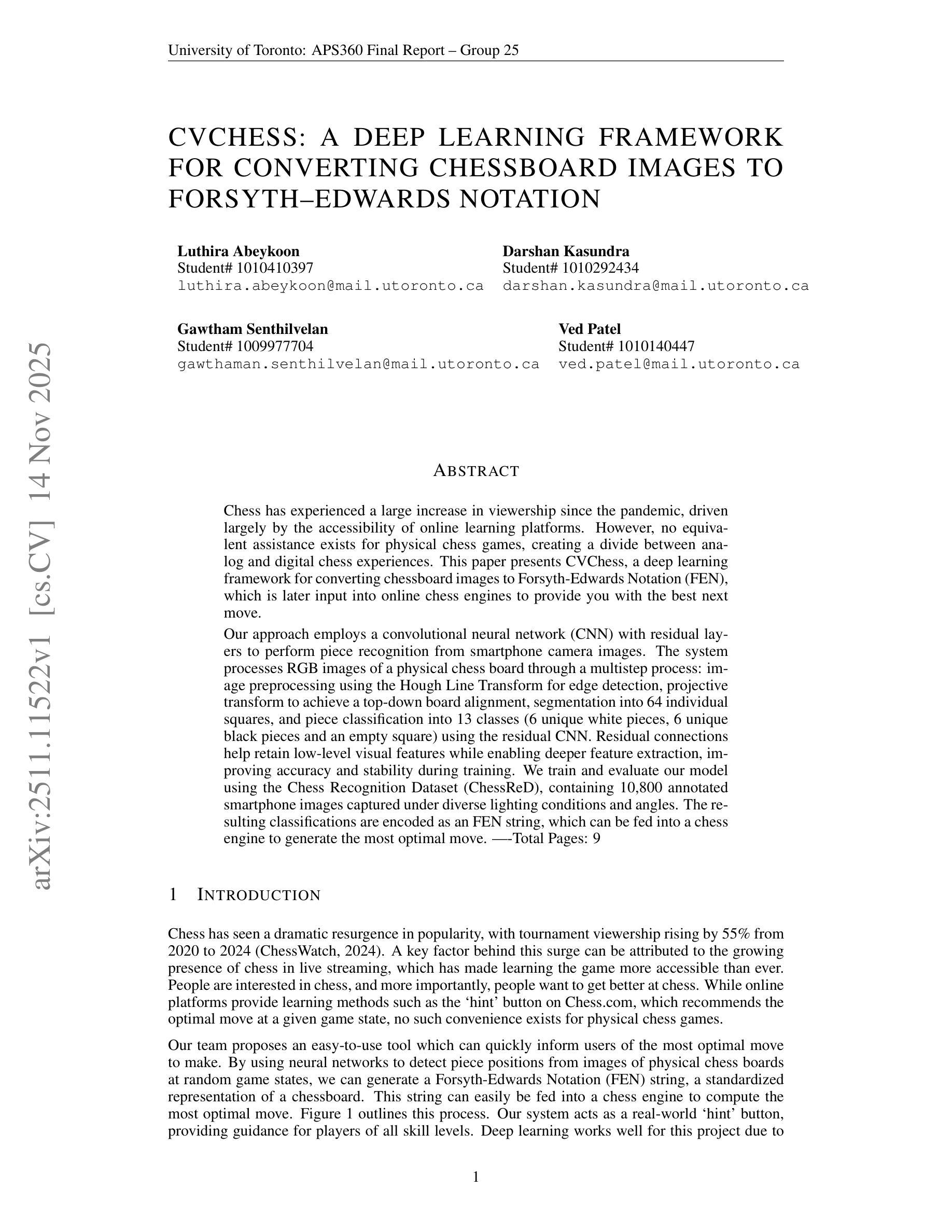 CVChess: A Deep Learning Framework for Converting Chessboard Images to Forsyth-Edwards Notation