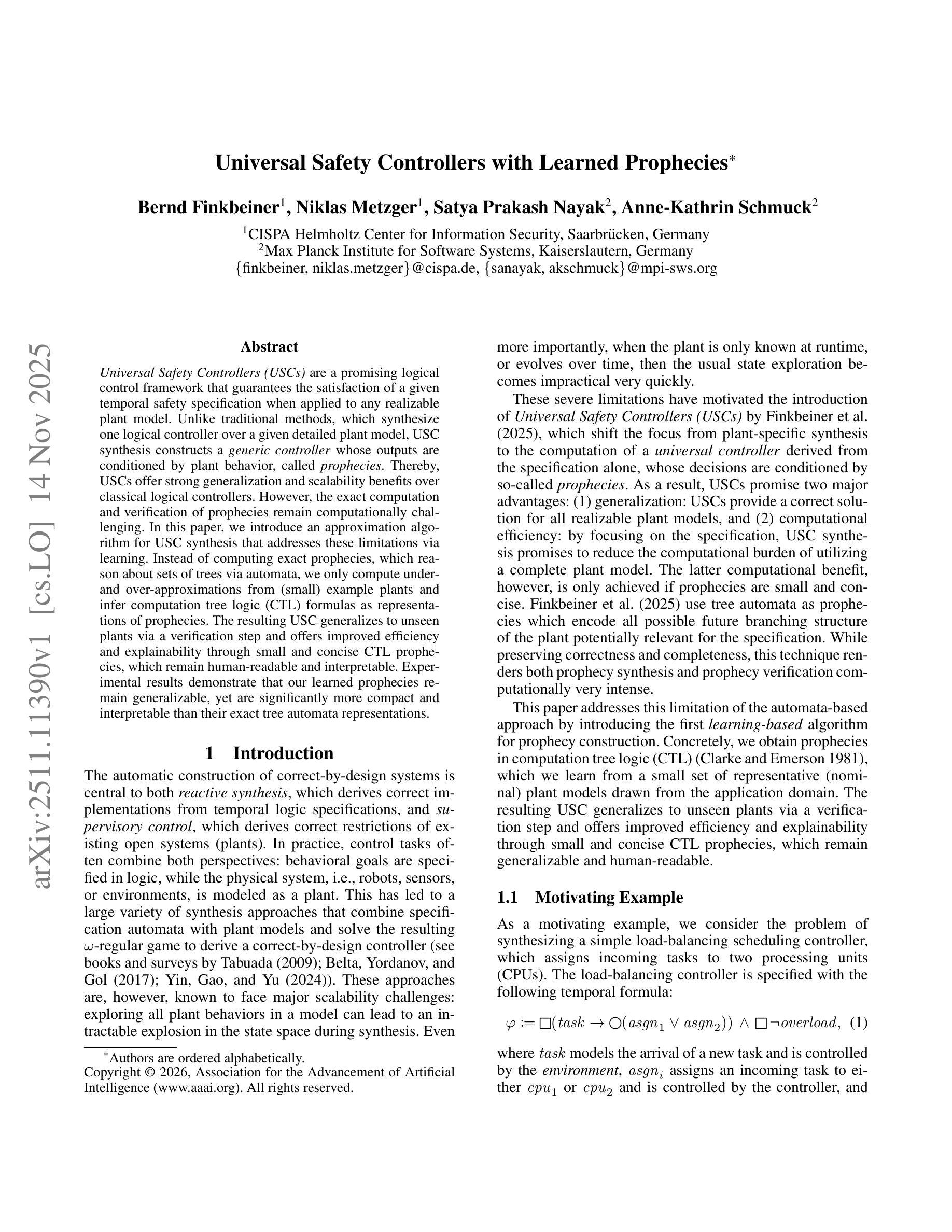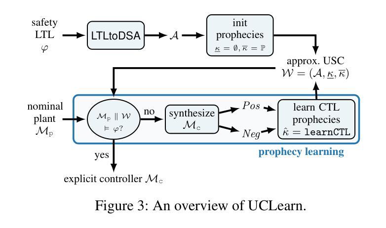 强调安全控制器(USCs)是一种有前景的逻辑控制框架,当应用于任何可实现的工厂模型时,它能保证给定时间安全规范的满足。与传统方法在给定详细的工厂模型上合成一个逻辑控制器不同,USC合成构建了一个通用控制器,其输出受工厂行为(称为预言)的影响。因此,与经典逻辑控制器相比,USCs提供了强大的通用性和可扩展性优势。然而,预言的精确计算和验证在计算上仍然具有挑战性。在本文中,我们介绍了一种用于USC合成的近似算法,该算法通过学习解决这些限制。我们不再计算精确的预言(通过自动机推理树集),而只从(小型)示例工厂计算预言的下界和上界,并推断计算树逻辑(CTL)公式作为预言的表示。所得USC通过验证步骤推广到未见过的工厂,并通过简洁且易于理解的CTL预言提高了效率和可解释性,这些预言保持人类可读和可解释性。实验结果表明,我们学习的预言具有通用性,并且与其精确树自动机表示相比,更加紧凑和可解释。