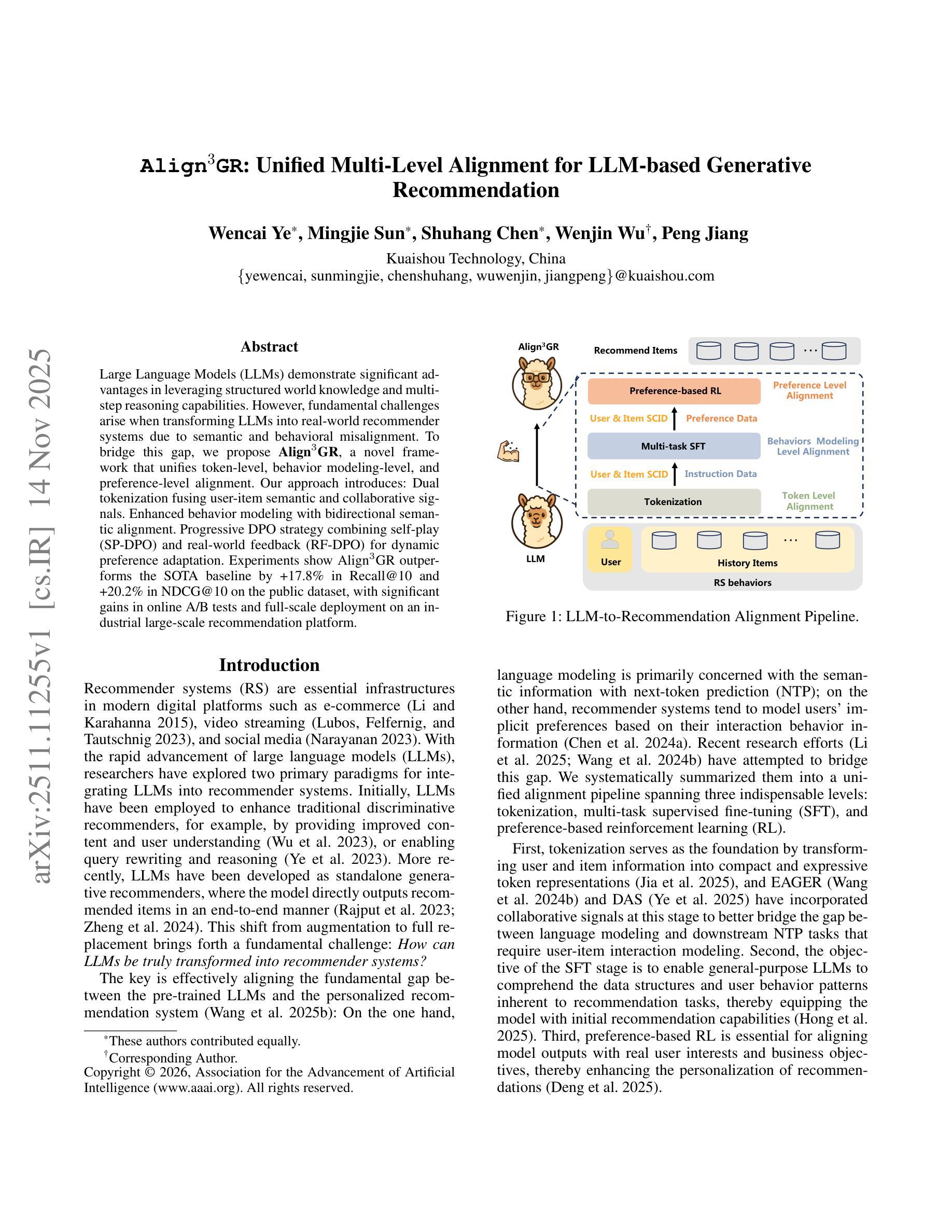 大型语言模型(LLMs)在利用结构化世界知识和多步推理能力方面展现出显著优势,但在将其转化为实际推荐系统时面临语义和行为失配的挑战。为此,提出了Align$^3$GR框架,该框架统一了令牌级、行为建模级和偏好级的对齐,通过双代币化融合用户项目语义和协同信号,增强了行为建模的双向语义对齐,并采用了结合自我游戏(SP-DPO)和现实世界反馈(RF-DPO)的渐进式DPO策略,实现动态偏好适应。在公开数据集上的实验表明,Align$^3$GR相比最先进基线在Recall@10和NDCG@10上的性能分别提高了+17.8%和+20.2%,在线A/B测试和大规模推荐平台上的全面部署也取得了显著成效。