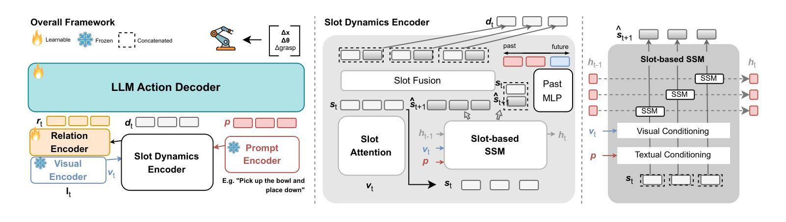 - Embodied-SlotSSM是一个针对时间可扩展性的槽位中心VLA框架,通过维持时空一致的槽位身份并利用槽位状态空间建模和关系编码器来实现上下文感知的行动预测。