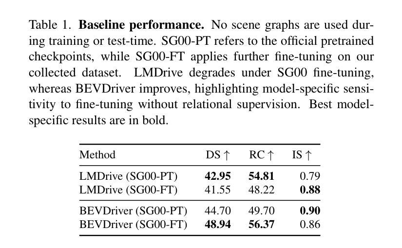 视觉语言模型最近作为自动驾驶的潜在规划器而出现,其成功取决于对空间结构和多模态输入的动态交互进行拓扑感知推理。然而,现有模型通常在没有明确编码这些关系依赖项的监督下进行训练,这限制了它们从原始传感器数据中推断出代理和其他交通实体如何相互影响的能力。在这项工作中,我们弥补了这一空白,提出了一种新颖的模型通用方法,该方法以交通场景图的形式对基于语言的驾驶模型进行结构化关系上下文条件设置。我们以各种抽象层次和格式序列化场景图,并通过结构化提示模板将它们纳入模型,从而能够系统地分析关系监督何时以及如何最有益。在公共LangAuto基准测试上的广泛评估显示,通过场景图条件设置的最先进方法能够在驾驶性能上产生巨大且持续的改进。值得注意的是,我们观察到LMDrive的驾驶得分提高了15.6%,BEVDriver提高了17.5%,这表明模型通过场景图条件训练能够更好地内部化和解释关系先验知识,即使不需要在测试时输入场景图。相关代码、微调后的模型和场景图数据集可公开访问:https://github.com/iis-esslingen/GraphPilot。