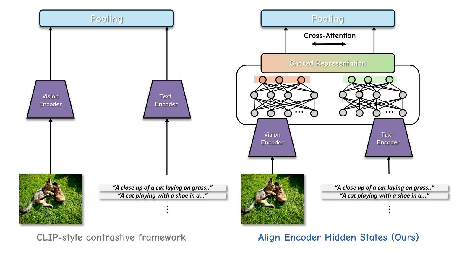 视觉语言模型(VLMs)通过融合图像和自然语言内容形成新的模型家族。现有方法通常在编码器内部融合早期或晚期信息,并依赖于自回归解码器进行融合。然而,直接对齐两种模态的隐藏状态是一种自然匹配它们“思考”的方式。本文提出了一种轻量级融合模块,即在两种编码器的顶部放置少量仅跨双向注意力层。这些层将视觉和文本编码器的隐藏状态序列投影到共享空间,跨模态关注并发送门控残差更新。同时添加简单的稳定器以改善对齐效果。该模型在检索、视觉问答和视觉推理标准测试中表现优异,同时保持了对比模型的双向效率。我们的代码公开在:[公开链接](请替换为真实的链接地址)。