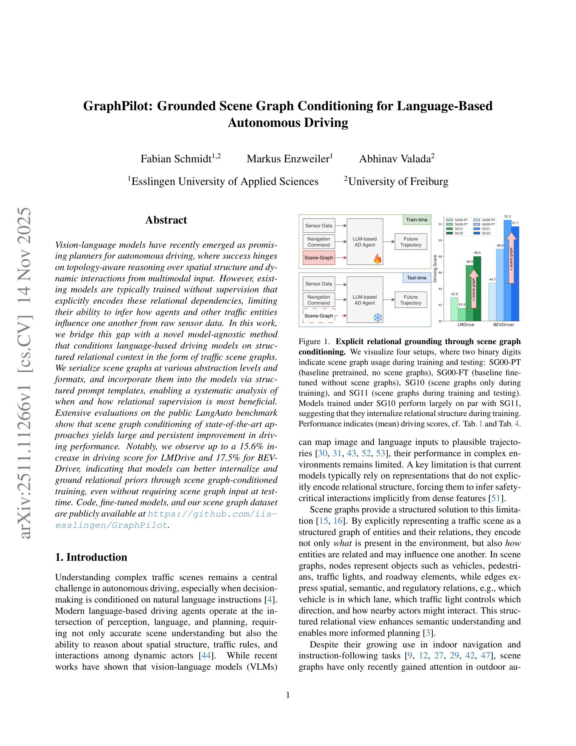 - 在LangAuto基准测试上的评估显示,场景图条件的最先进方法能显著提高驾驶性能。