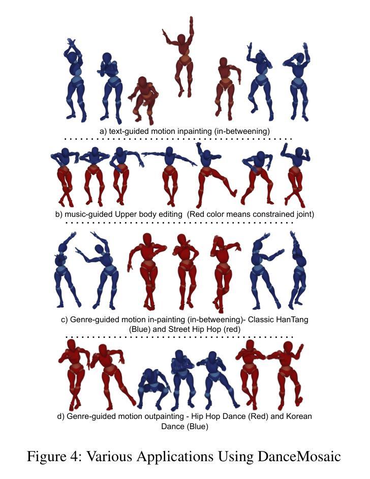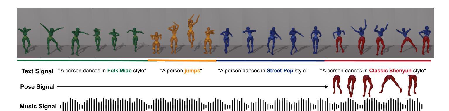 - 该方法能够将多种指导信号(如音乐、风格和姿势)映射到高质量舞蹈动作序列。