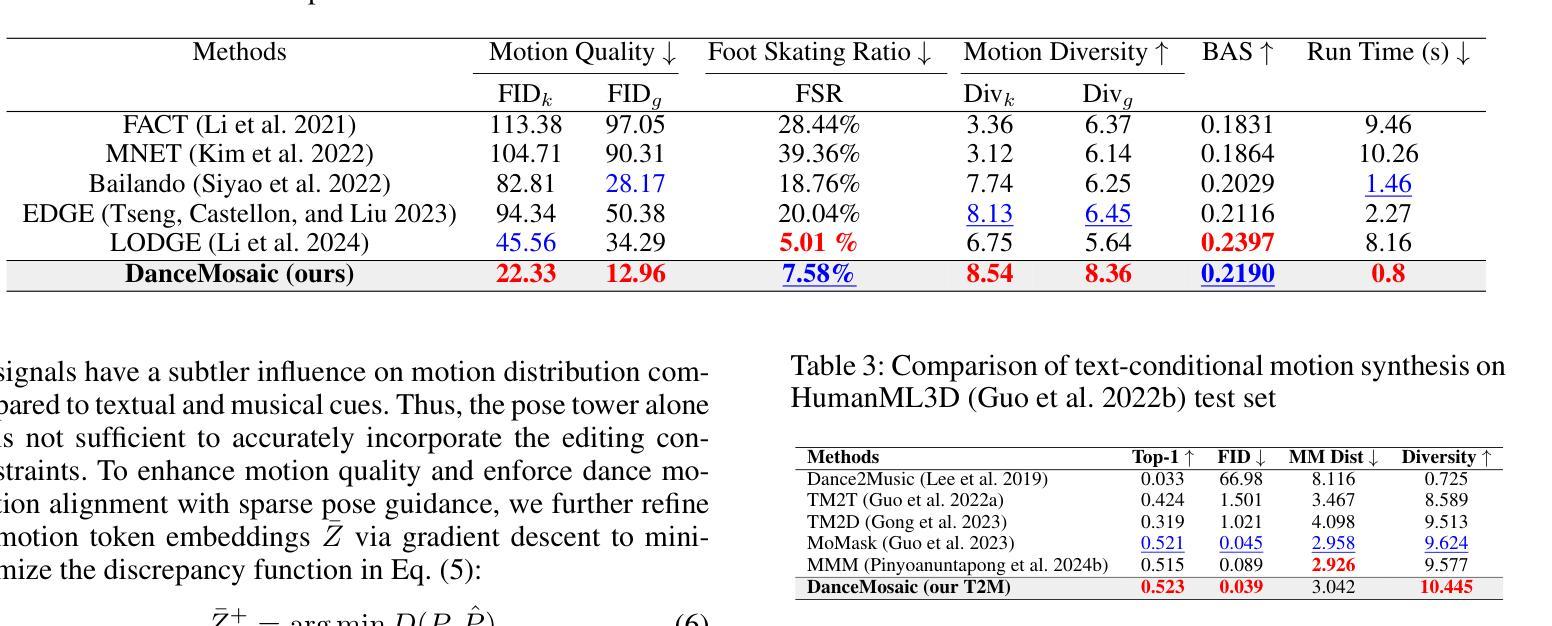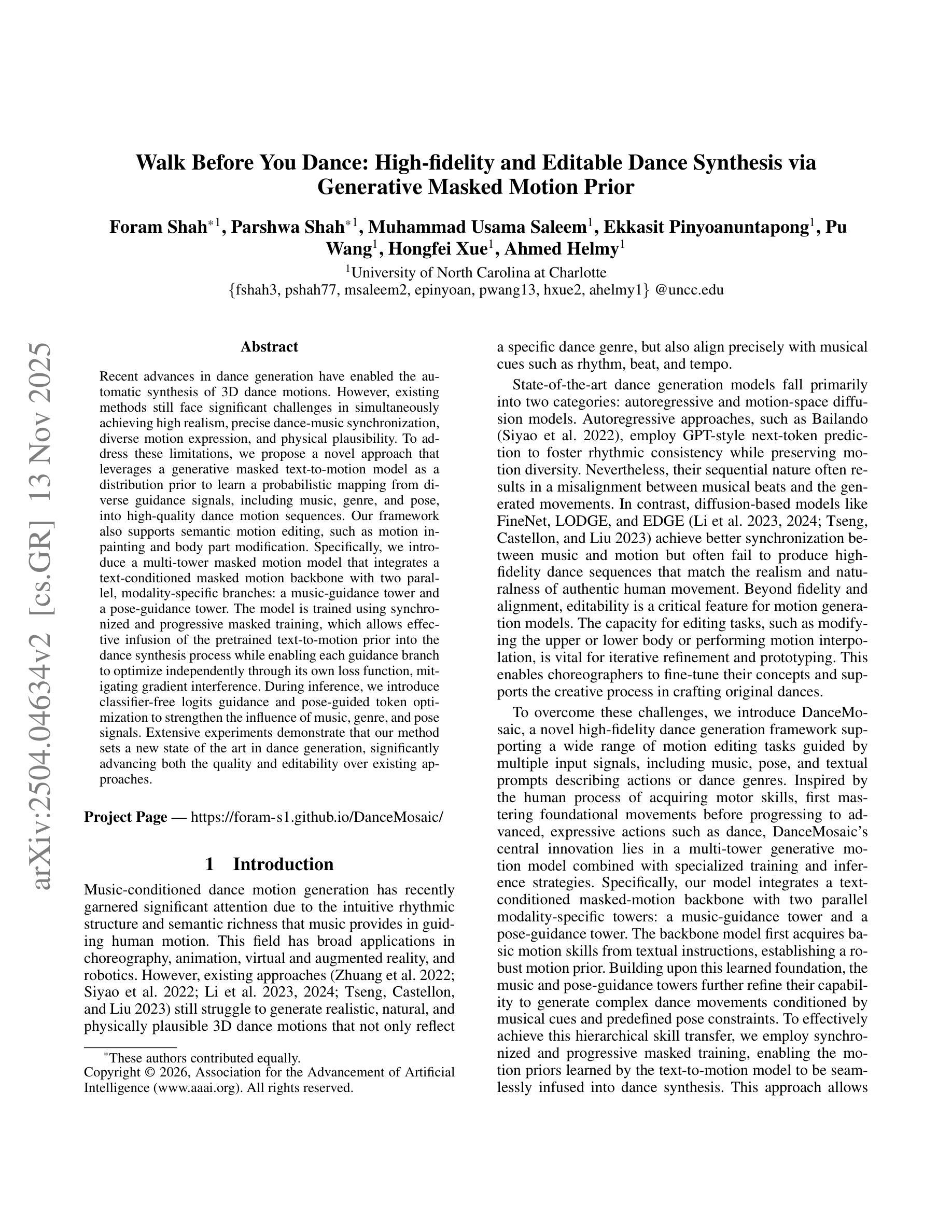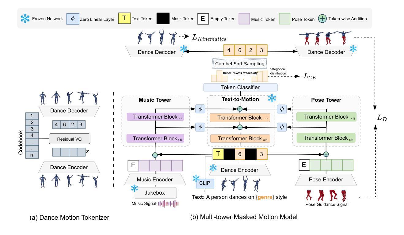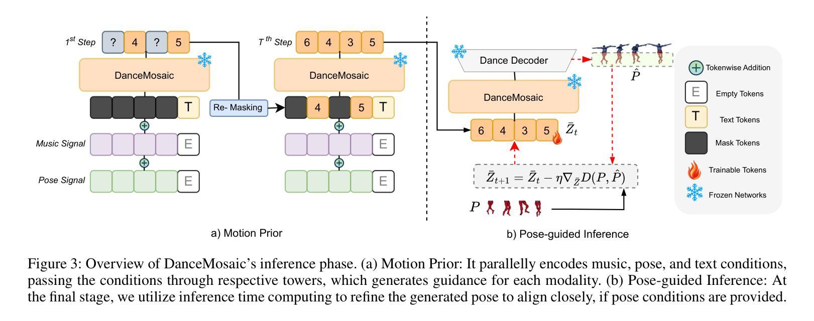近期舞蹈生成技术的进展已经能够实现3D舞蹈动作的自动合成。然而,现有方法仍然面临着同时实现高逼真度、精确的舞蹈音乐同步、丰富的动作表达和物理可行性的重大挑战。为了解决这些局限性,我们提出了一种新颖的方法,利用生成式掩码文本到运动模型作为分布先验来学习从多种引导信号(包括音乐、风格和姿势)到高质量舞蹈动作序列的概率映射。我们的框架还支持语义运动编辑,如运动补全和身体部位修改。具体来说,我们引入了一个多塔式掩膜运动模型,该模型将文本条件掩膜运动主干与两个并行、模态特定的分支相结合:音乐引导塔和姿势引导塔。该模型采用同步和渐进的掩膜训练,这允许有效地将预训练的文本到运动先验融入舞蹈合成过程,同时使每个引导分支能够通过自己的损失函数进行优化,减轻梯度干扰。在推理过程中,我们引入了无分类器对数几率引导和姿势引导令牌优化,以加强音乐、风格和姿势信号的影响。大量实验表明,我们的方法在舞蹈生成方面树立了新的最先进的水平,在质量和可编辑性方面均显著优于现有方法。项目页面可在https://foram-s1.github.io/DanceMosaic/访问。