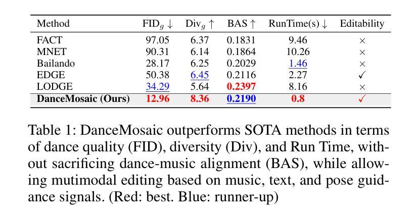 本文提出了一种基于生成性掩模文本到运动模型的新型舞蹈生成方法,该方法可作为概率分布先验来学习从多种指导信号(包括音乐、风格和姿势)到高质量舞蹈动作序列的映射。该方法支持语义运动编辑,如运动补全和身体部位修改。通过引入多塔掩模运动模型和同步渐进掩模训练,该方法在舞蹈生成中实现了高质量、精确的音乐同步、丰富的运动表达和物理可行性。