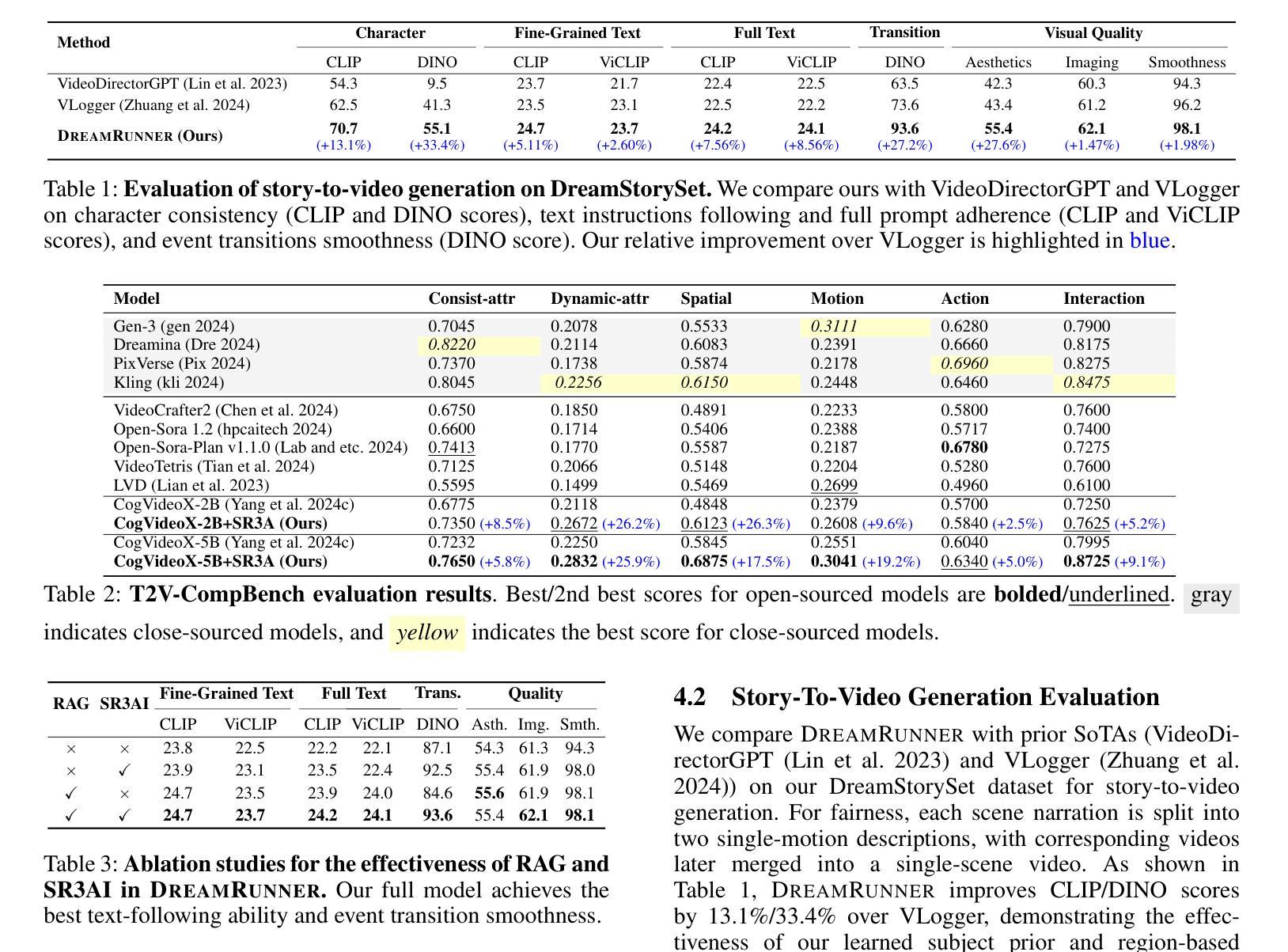- DREAMRUNNER在角色一致性、文本对齐和顺畅过渡等方面具有卓越性能。
