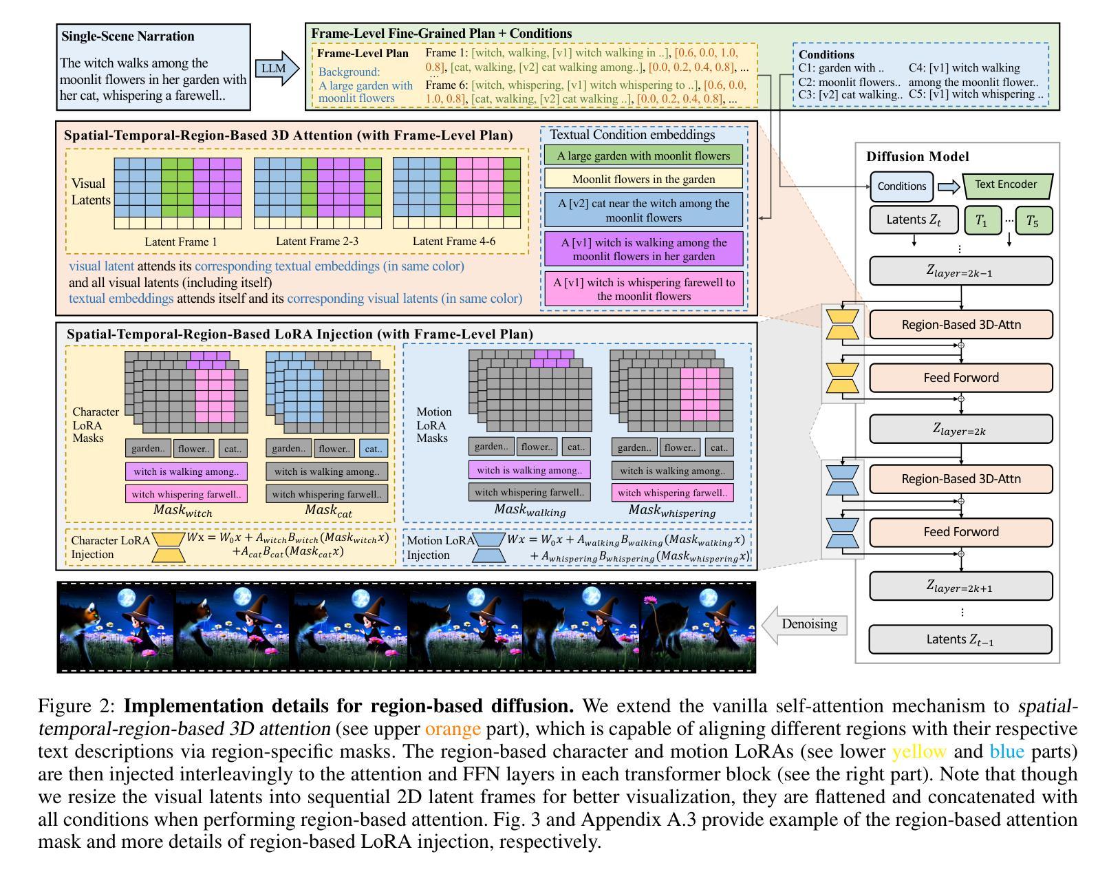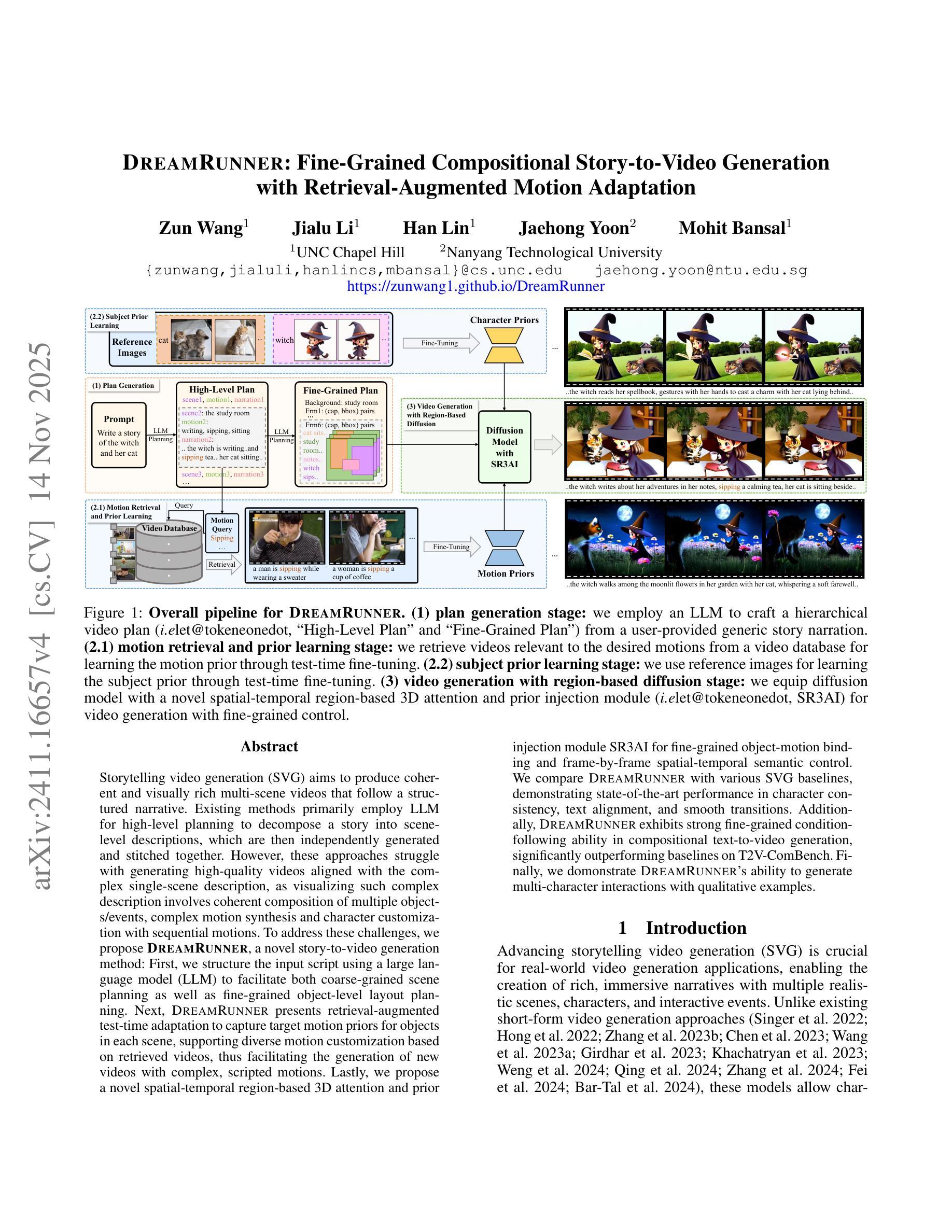 故事叙述视频生成(SVG)旨在生成连贯且视觉丰富的多场景视频,遵循结构化的叙事。现有方法主要使用大型语言模型(LLM)进行高级规划,将故事分解为场景级描述,然后独立生成并拼接在一起。然而,这些方法在生成与复杂单场景描述相符的高质量视频方面遇到困难,因为可视化这样的复杂描述涉及到多个角色和事件的连贯组合、复杂的动作合成和多角色定制。为了解决这些挑战,我们提出了DREAMRUNNER,一种新颖的故事到视频生成方法:首先,我们使用大型语言模型(LLM)对输入脚本进行结构化处理,以促进粗粒度的场景规划和细粒度的对象级布局规划。接下来,DREAMRUNNER呈现检索增强的测试时适应,以捕获每个场景中目标物体的目标运动先验,支持基于检索视频的多样化运动定制,从而便于生成具有复杂脚本动作的新视频。最后,我们提出了基于时空区域的新型3D注意力和先验注入模块SR3AI,用于细粒度对象运动绑定和逐帧时空语义控制。我们将DREAMRUNNER与各种SVG基线进行了比较,在角色一致性、文本对齐和顺畅过渡方面展示了卓越的性能。此外,DREAMRUNNER在组合文本到视频的生成中表现出强大的精细条件跟随能力,在T2V-ComBench上显著优于基线。最后,我们通过定性示例验证了DREAMRUNNER生成多对象交互的稳健能力。