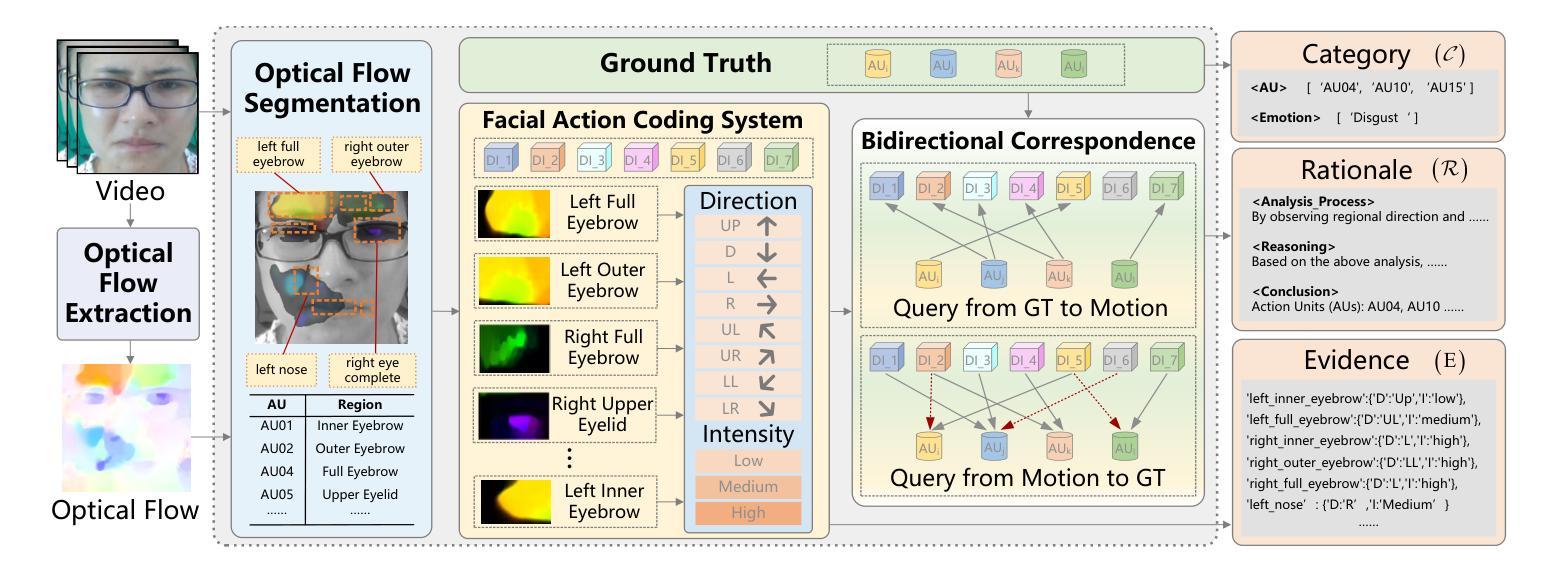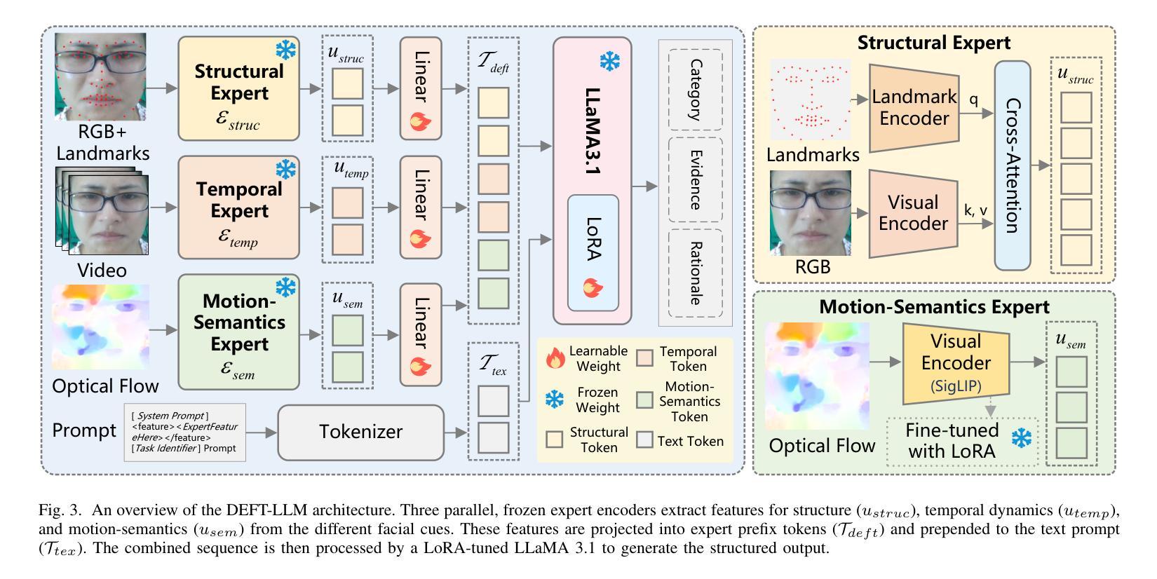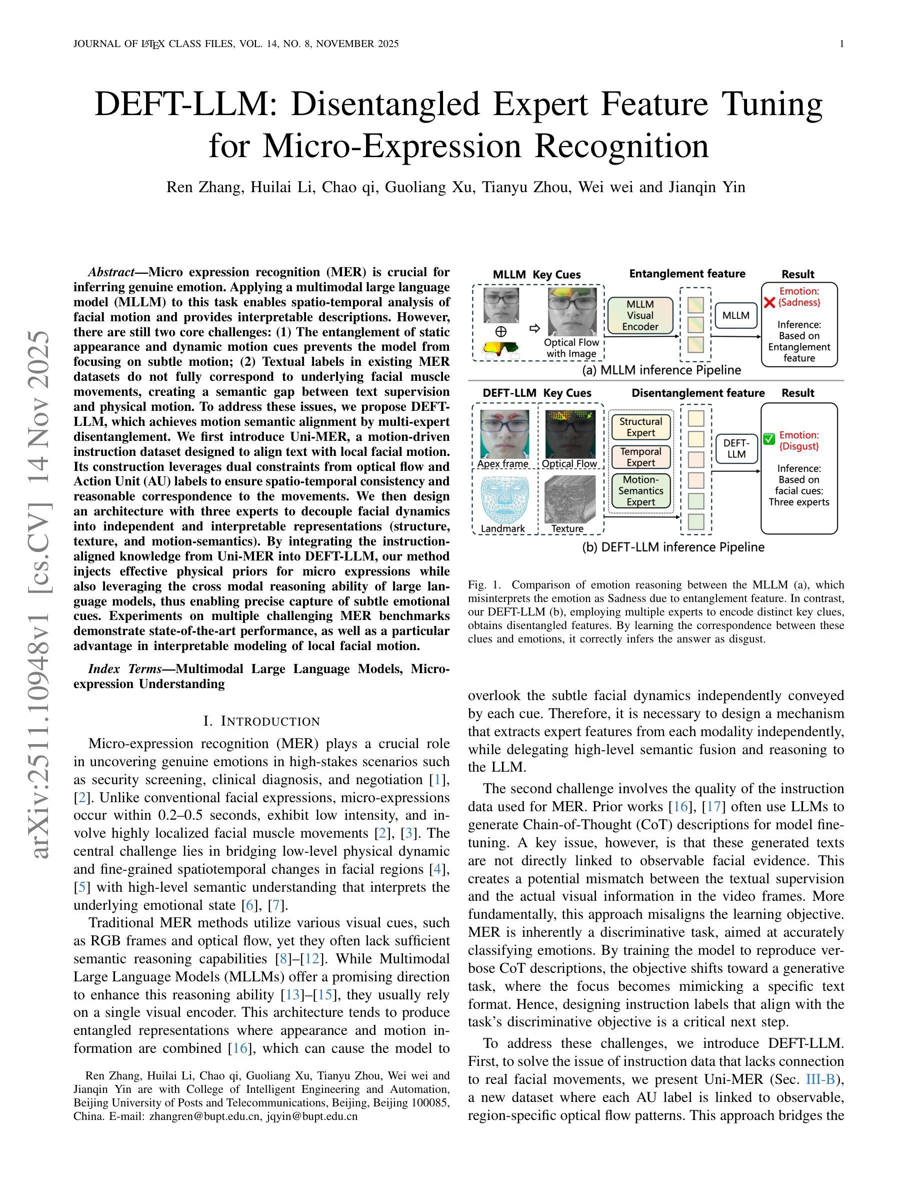 微表情识别(MER)对于推断真实情绪至关重要。将多模态大型语言模型(MLLM)应用于此任务,可以实现面部运动的时空分析,并提供可解释的描述。然而,仍然存在两个核心挑战:(1)静态外观和动态运动线索的纠缠,阻碍了模型对细微运动的关注;(2)现有MER数据集中的文本标签与潜在的面部肌肉运动不完全对应,从而在文本监督和物理运动之间产生了语义鸿沟。为了解决这些问题,我们提出了DEFT-LLM,它通过多专家分解实现运动语义对齐。我们首先引入了Uni-MER,这是一个运动驱动指令数据集,旨在将文本与局部面部运动对齐。其构建利用光流和动作单元(AU)标签的双重约束,以确保时空一致性和与运动的合理对应。然后,我们设计了一个包含三个专家的架构,将面部动态解耦为独立且可解释的表示(结构、动态纹理和运动语义)。通过将Uni-MER的指令对齐知识注入DEFT-LLM,我们的方法在利用大型语言模型的跨模态推理能力的同时,为微表情注入有效的物理先验知识,从而能够精确捕捉细微的情绪线索。在多个具有挑战性的MER基准上的实验证明了其卓越的性能,特别是在局部面部运动的可解释建模方面具有明显的优势。