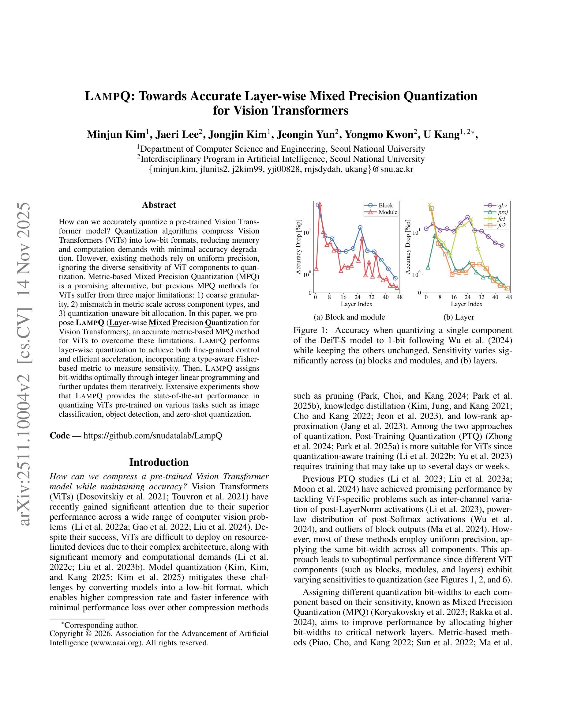 本文介绍了如何准确量化预训练的Vision Transformer模型。现有方法主要依赖统一精度,忽略了Vision Transformer组件对量化的不同敏感度。本文提出了一种基于度量的混合精度量化(MPQ)方法——LampQ,以克服这一局限性。LampQ通过逐层量化实现精细粒度的控制和高效加速,并引入基于Fisher的组件感知度量来衡量敏感度。此外,LampQ通过整数线性规划优化分配位宽,并进行了迭代更新。实验表明,LampQ在图像分类、目标检测和零样本量化等任务上预训练的Vision Transformer模型的量化性能达到最新水平。