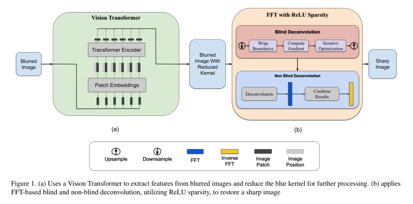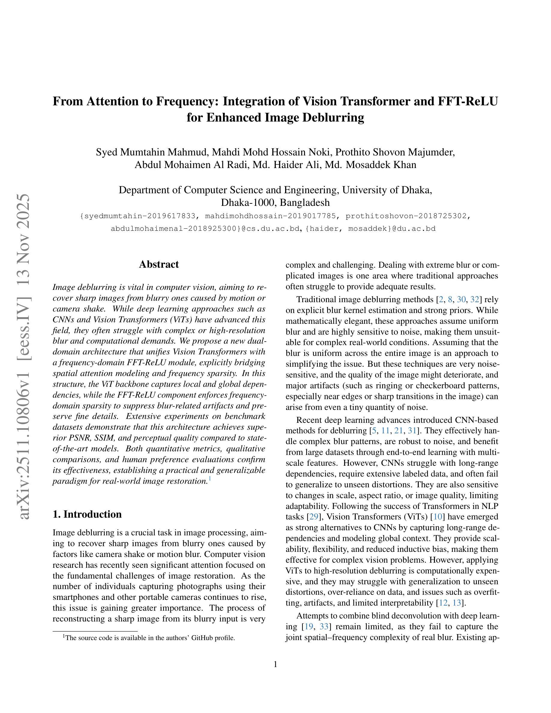 图像去模糊在计算机视觉中至关重要,旨在从由于运动或相机抖动导致的模糊图像中恢复出清晰的图像。虽然深度学习方法(如卷积神经网络和视觉转换器(ViTs))已经推动了该领域的发展,但它们通常难以处理复杂或高分辨率的模糊和计算需求。我们提出了一种新的双域架构,该架构统一了视觉变压器与频率域的FFT-ReLU模块,显式地建立了空间注意力建模和频率稀疏性之间的桥梁。在这种结构中,ViT骨干网捕捉局部和全局依赖性,而FFT-ReLU组件强制实施频率域稀疏性,以抑制与模糊相关的伪影并保留细节。在基准数据集上的大量实验表明,该架构与最新模型相比,在峰值信噪比(PSNR)、结构相似性(SSIM)和感知质量方面实现了卓越的性能。定量指标、定性比较和人类偏好评估都证实了其有效性,为现实世界图像恢复建立了实用且通用的范式。