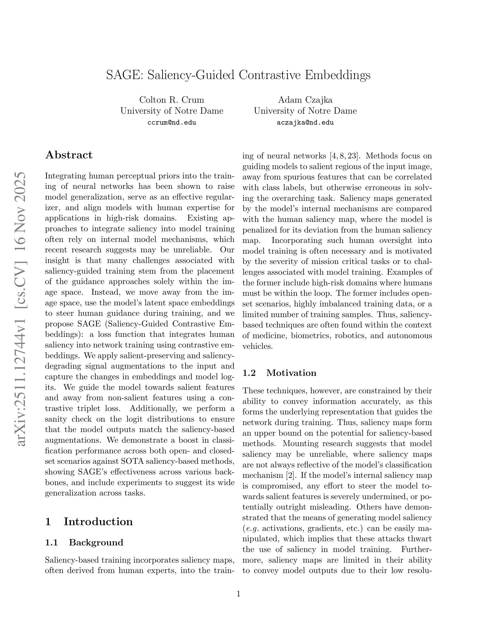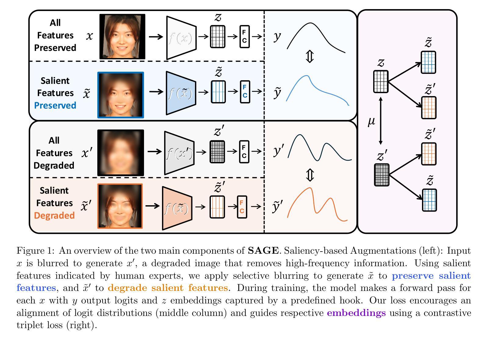 将人类感知先验知识融入神经网络训练已被证明可以提高模型的泛化能力,充当有效的正则化器,并用于高风险领域应用时与人类专业知识对齐。现有的将显著性整合到模型训练中的方法通常依赖于内部模型机制,但最近的研究表明这些机制可能不可靠。我们的见解是,许多与显著性引导训练相关的挑战都源于指导方法仅设置在图像空间内。相反,我们远离图像空间,使用模型的潜在空间嵌入来引导人类指导进行训练,并提出SAGE(显著性引导对比嵌入):一种使用对比嵌入将人类显著性整合到网络训练中的损失函数。我们对输入应用显著保留和显著性降低的信号增强,并捕获嵌入和模型逻辑中的变化。我们使用对比三元组损失引导模型朝向显著特征并远离非显著特征。此外,我们对逻辑分布执行健全性检查,以确保模型输出与基于显著性的增强相匹配。我们在开放和封闭场景的情况下,与最先进的基于显著性的方法相比,展示了分类性能的提升,证明了SAGE在不同主干网络中的有效性,并进行了实验以表明其在不同任务中的广泛泛化能力。