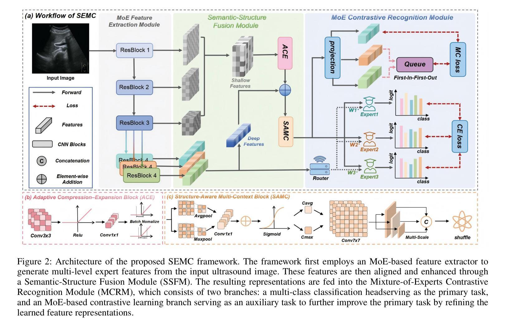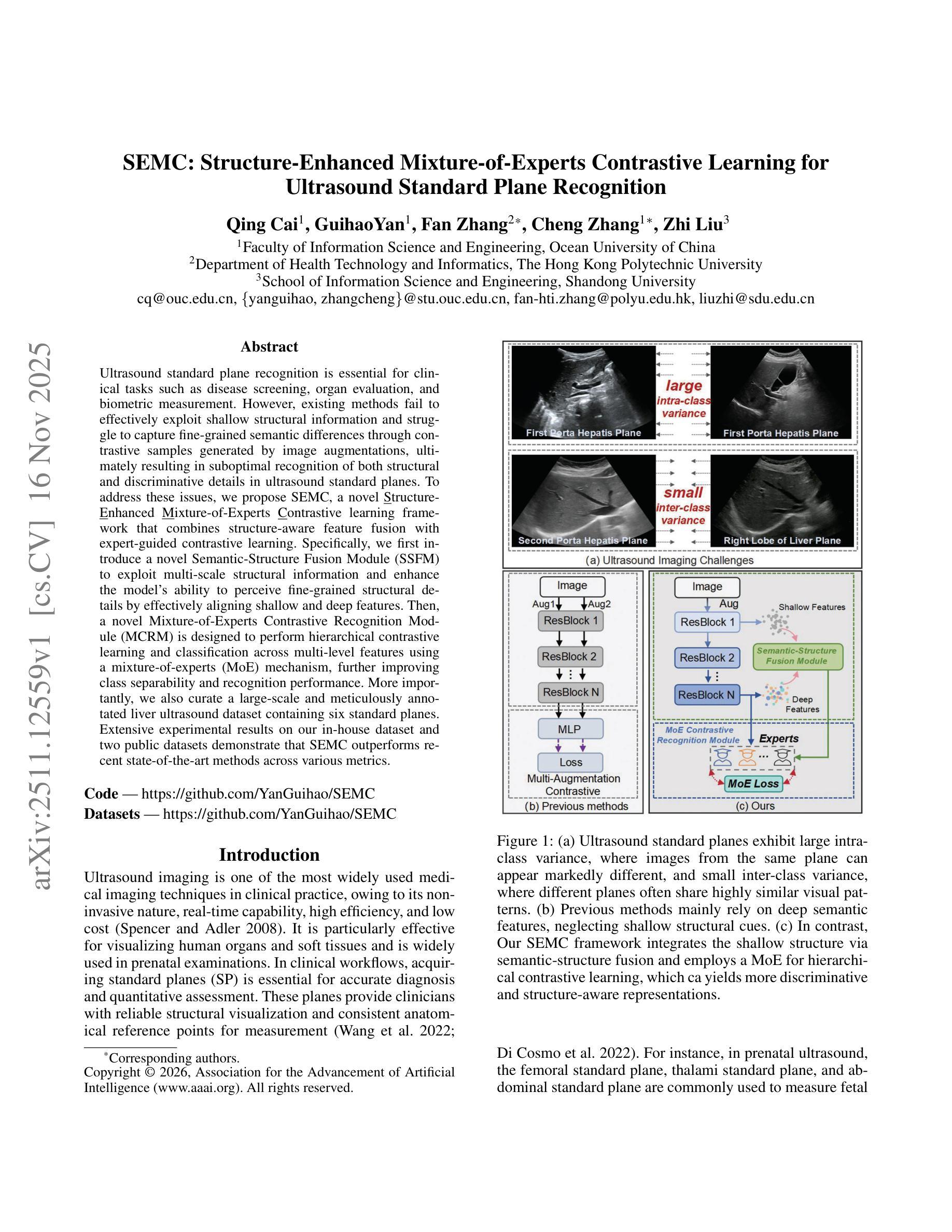 超声标准平面识别在临床任务中至关重要,如疾病筛查、器官评估和生物测量。然而,现有方法未能有效利用浅层结构信息,并且在通过图像增强生成对比样本时,难以捕捉细微的语义差异,最终导致超声标准平面的结构和判别细节识别不佳。为了解决这些问题,我们提出了SEMC,这是一个结合结构感知特征融合和专家指导对比学习的新型结构增强混合专家对比学习框架。具体来说,我们首先引入了一个新的语义结构融合模块(SSFM),以利用多尺度结构信息,并通过有效对齐浅层和深层特征,提高模型感知细微结构细节的能力。然后,设计了一个新颖的专家混合对比识别模块(MCRM),通过专家混合(MoE)机制在多层次特征上执行分层对比学习和分类,进一步提高类间可分性和识别性能。更重要的是,我们还精心制作了一个包含六个标准平面的大规模肝脏超声数据集,并进行了细致的标注。在我们自制数据集和两个公开数据集上的大量实验结果表明,SEMC在各项指标上均优于最新的先进方法。
