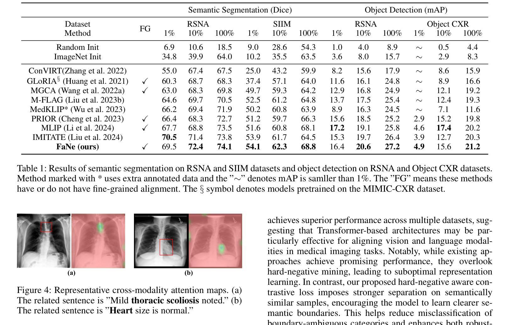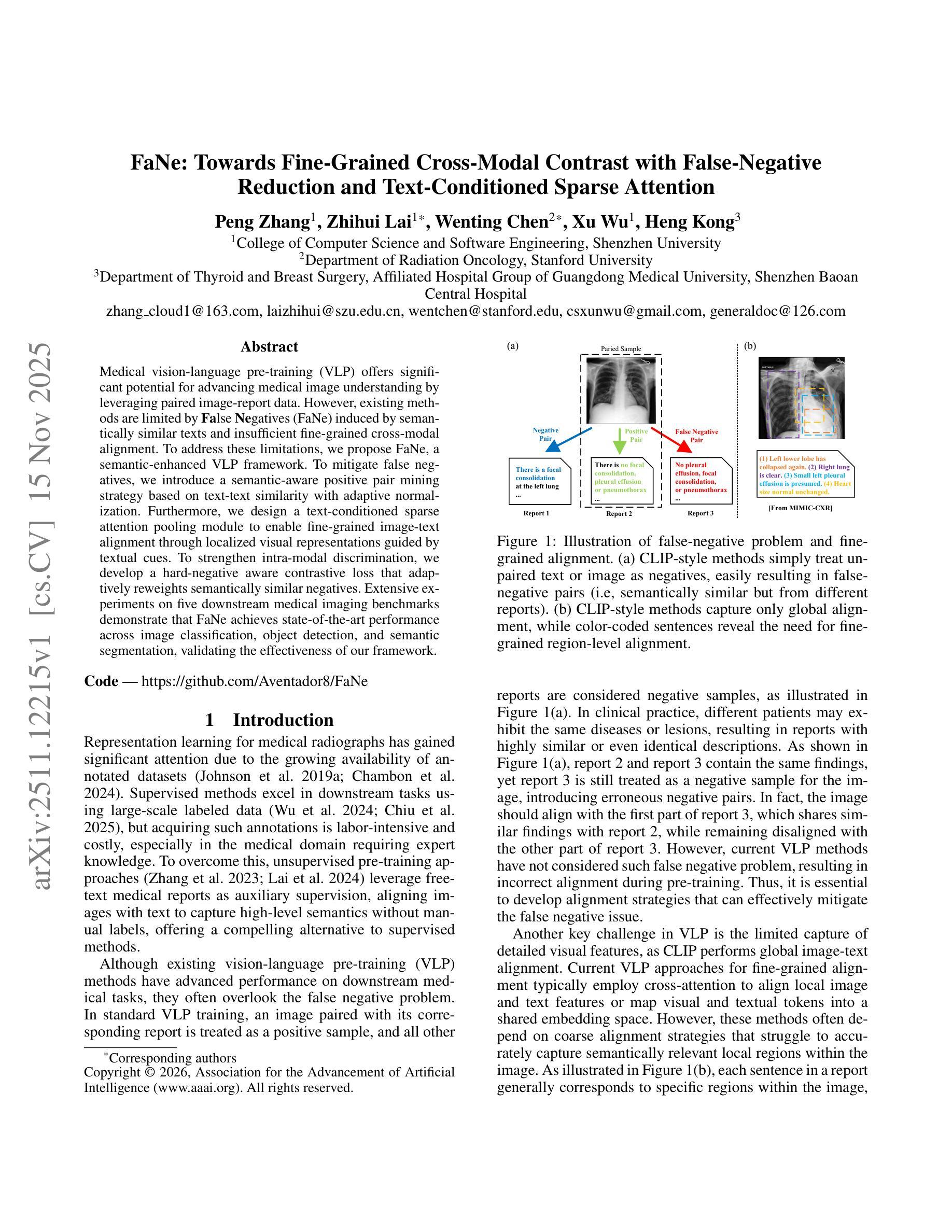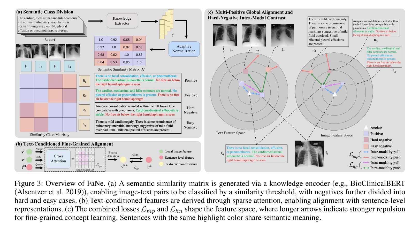 医学视觉-语言预训练(VLP)通过利用配对图像-报告数据,在推进医学图像理解方面显示出巨大的潜力。然而,现有方法受到语义相似文本产生的假阴性(FaNe)和不足的细粒度跨模态对齐的限制。为了解决这些局限性,我们提出了FaNe,一种语义增强的VLP框架。为了减轻假阴性,我们提出了一种基于文本-文本相似性的语义感知正向配对挖掘策略,并进行了自适应归一化。此外,我们设计了一个文本调节的稀疏注意力池模块,通过文本线索引导的局部视觉表示,实现细粒度的图像文本对齐。为了加强模态内判别力,我们开发了一种硬负样本感知对比损失,该损失可以自适应地重新加权语义上相似的负样本。在五个下游医学影像基准测试上的大量实验表明,FaNe在图像分类、目标检测和语义分割方面达到了最新水平,验证了我们框架的有效性。