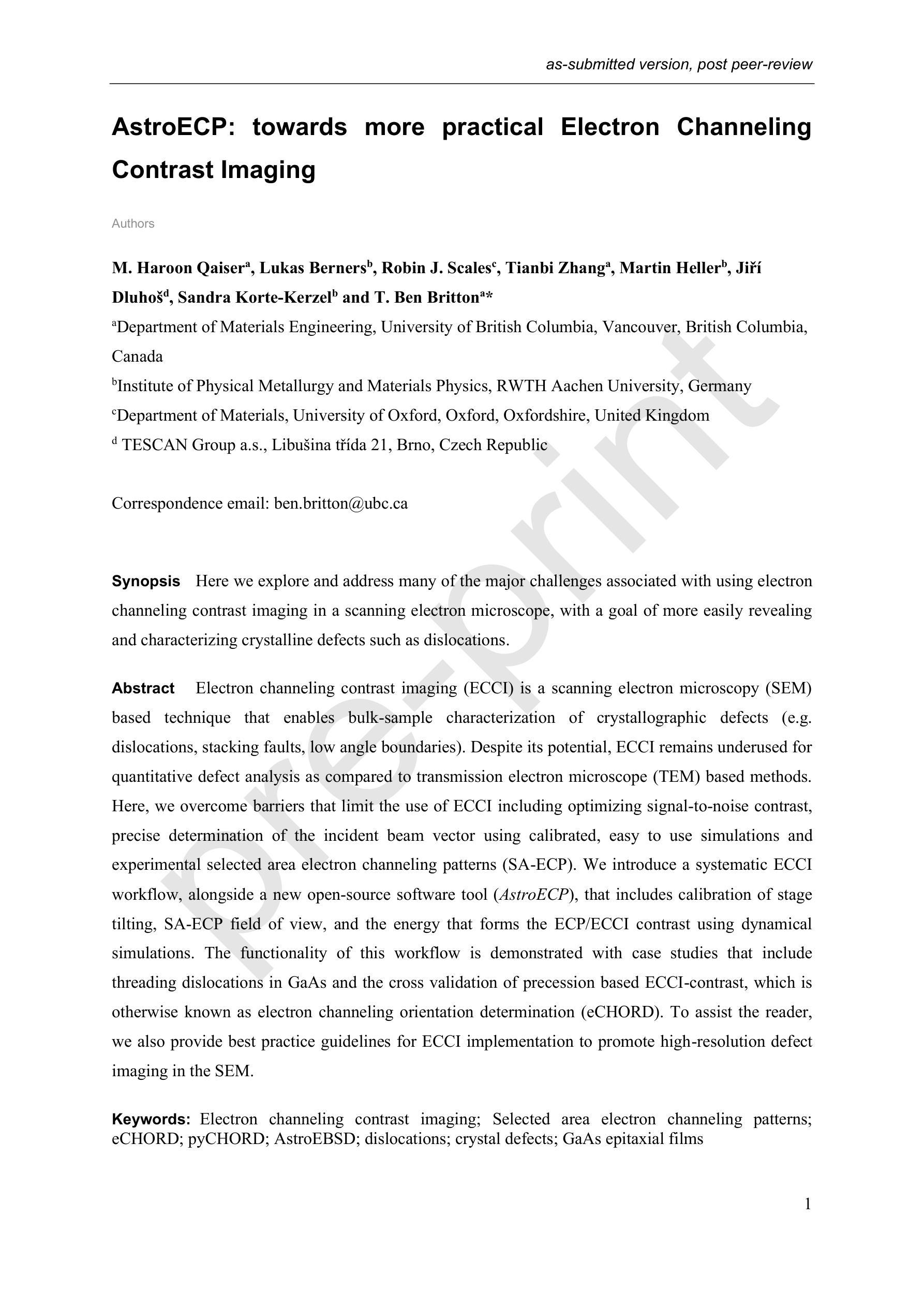 电子通道衬度成像(ECCI)是一种基于扫描电子显微镜(SEM)的技术,能够对晶体缺陷(例如位错、层错、小角度边界)进行整体样品表征。尽管它具有潜力,但与透射电子显微镜(TEM)方法相比,ECCI在定量缺陷分析方面的应用仍然较少。在这里,我们克服了限制ECCI使用的障碍,包括优化信噪比衬度、使用校准的且易于使用的模拟以及实验选区电子通道模式(SA-ECP)精确确定入射光束矢量。我们引入了一个系统的ECCI工作流程,以及一个新的开源软件工具(AstroECP),包括校准倾斜阶段、SA-ECP视野以及形成ECP/ECCI衬度的能量动态模拟。该功能通过案例研究得到证明,包括GaAs中的穿线位错以及基于精度的ECCI衬度(也称为电子通道取向测定法(eCHORD))的交叉验证。为了帮助读者,我们还提供了ECCI实施的最佳实践指南,以促进SEM中的高分辨率缺陷成像。