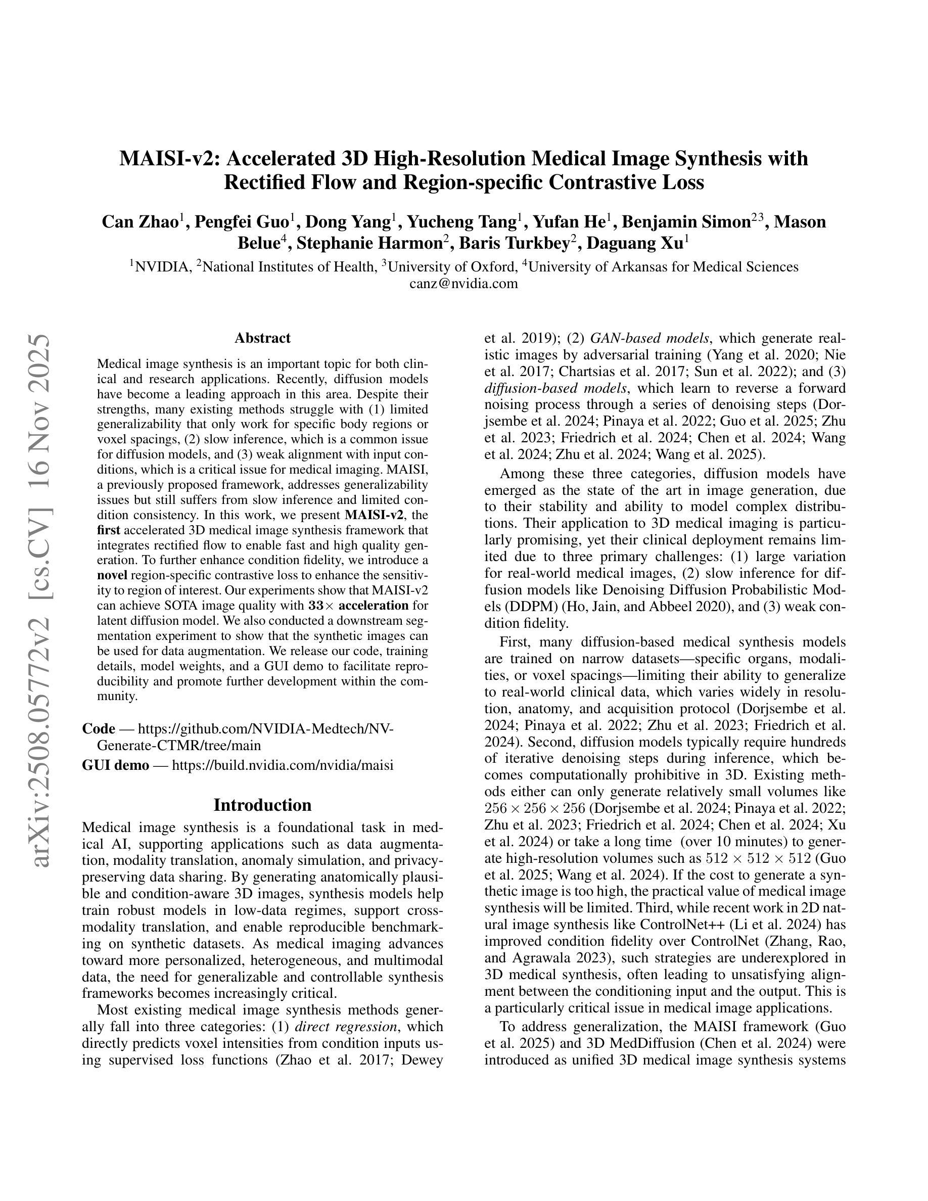 医疗图像合成是临床和研究应用的重要课题,近期扩散模型成为该领域的主流方法。但现有方法存在通用性有限、推理速度慢以及与输入条件对齐不佳等问题。MAISI-v2是首个加速的3D医疗图像合成框架,通过整合矫正流实现快速、高质量生成。为提高条件保真度,引入区域特定对比损失以增强对感兴趣区域的敏感性。实验显示,MAISI-v2可在潜在扩散模型上实现$33 \times$加速,同时保持图像质量。此外,进行下游分割实验证明合成图像可用于数据增强。