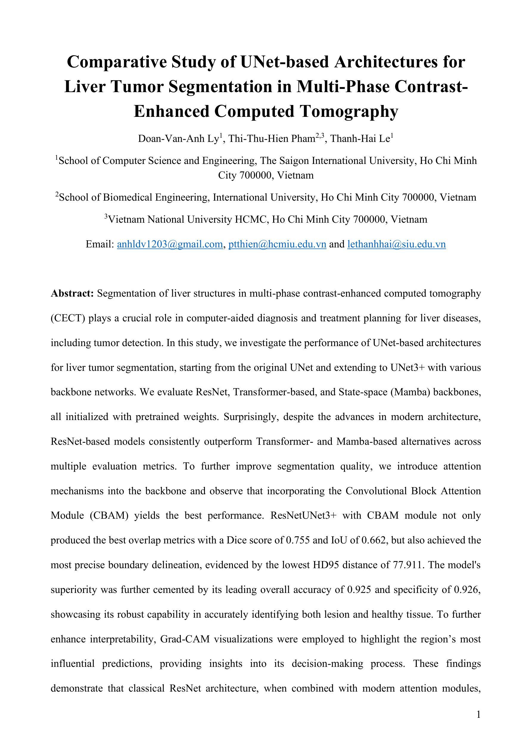 在多期相增强计算机断层扫描(CECT)中,肝脏结构的分割对于肝脏疾病的计算机辅助诊断和治疗计划,包括肿瘤检测,起着至关重要的作用。本研究中,我们调查了基于UNet架构的肝脏肿瘤分割性能,从原始UNet扩展到带有各种骨干网络的UNet3+。我们评估了ResNet、基于Transformer和State-space(Mamba)的骨干网络,它们都以预训练权重进行初始化。令人惊讶的是,尽管现代架构有所进步,但基于ResNet的模型在多个评估指标上始终优于基于Transformer和Mamba的替代方案。为了进一步提高分割质量,我们将注意力机制引入到骨干网络中,并观察到加入卷积块注意力模块(CBAM)会取得最佳性能。带有CBAM模块的ResNetUNet3+不仅以Dice得分0.755和IoU得分0.662的最佳重叠度指标展现出最好的性能,而且实现了最精确的边缘描绘,以最低的HD95距离77.911为证明。该模型的总体准确度达到0.925和特异性达到0.926,显示出其准确识别病灶和正常组织的稳健能力。为了进一步增加解释性,采用了Grad-CAM可视化来突出显示对预测最具有影响力的区域,提供了对其决策过程的见解。这些发现表明,经典的ResNet架构与现代的注意力模块相结合时,在医学图像分割任务中仍具有高度的竞争力,为临床实践中肝脏肿瘤检测提供了有前景的方向。