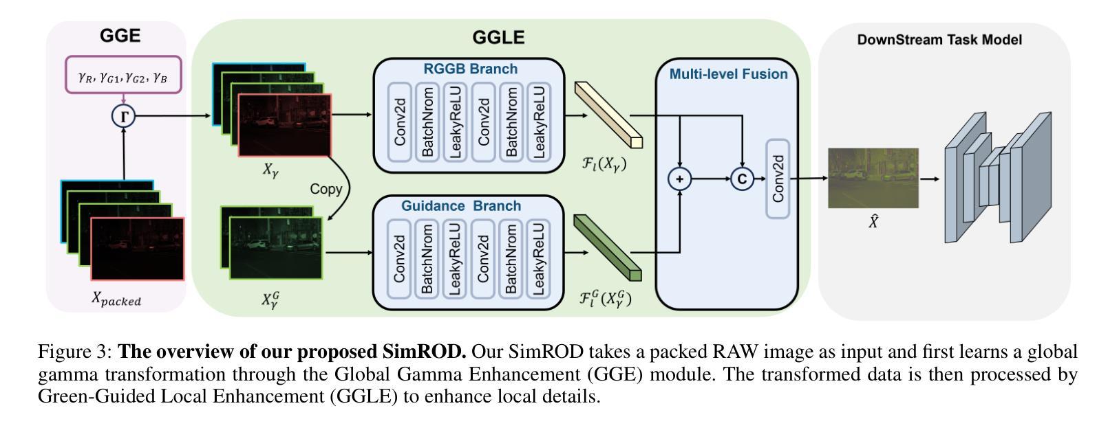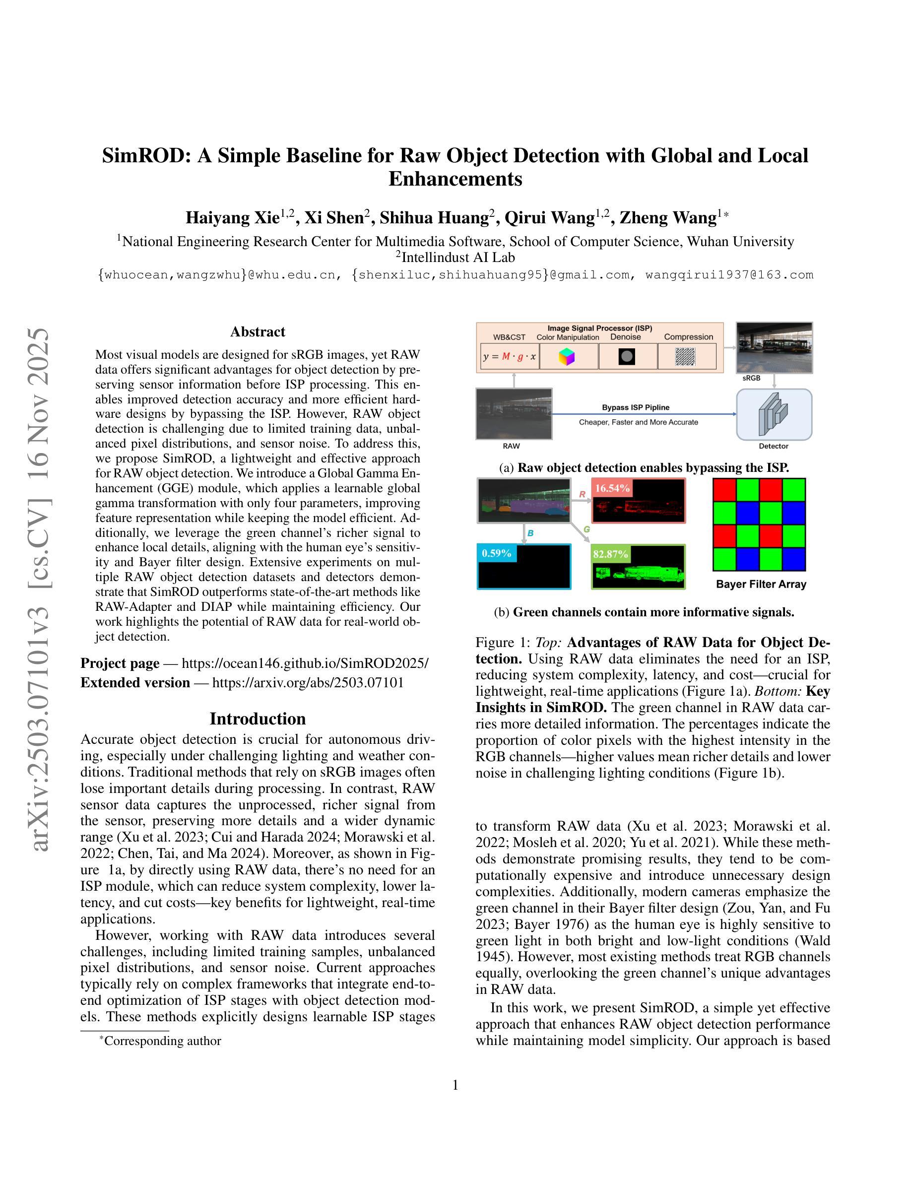 大多数视觉模型都是为sRGB图像设计的,然而RAW数据在对象检测方面具有显著优势,它能够保留ISP处理前的传感器信息。这通过绕过ISP,实现了更高的检测精度和更有效的硬件设计。然而,RAW对象检测面临有限的训练数据、像素分布不平衡和传感器噪声等挑战。为了解决这些问题,我们提出了SimROD,这是一种用于RAW对象检测的轻量级且有效的方法。我们引入了全局伽马增强(GGE)模块,该模块仅使用四个参数应用可学习的全局伽马变换,在保持模型效率的同时,改进了特征表示。此外,我们利用绿色通道更丰富的信号增强局部细节,这与人眼的敏感度和Bayer滤镜设计相一致。在多个RAW对象检测数据集和检测器上的广泛实验表明,SimROD在保持效率的同时,优于RAW-Adapter和DIAP等最先进的方法。我们的研究工作突出了RAW数据在现实对象检测中的潜力。代码可访问:https://ocean146.github.io/SimROD2025/。