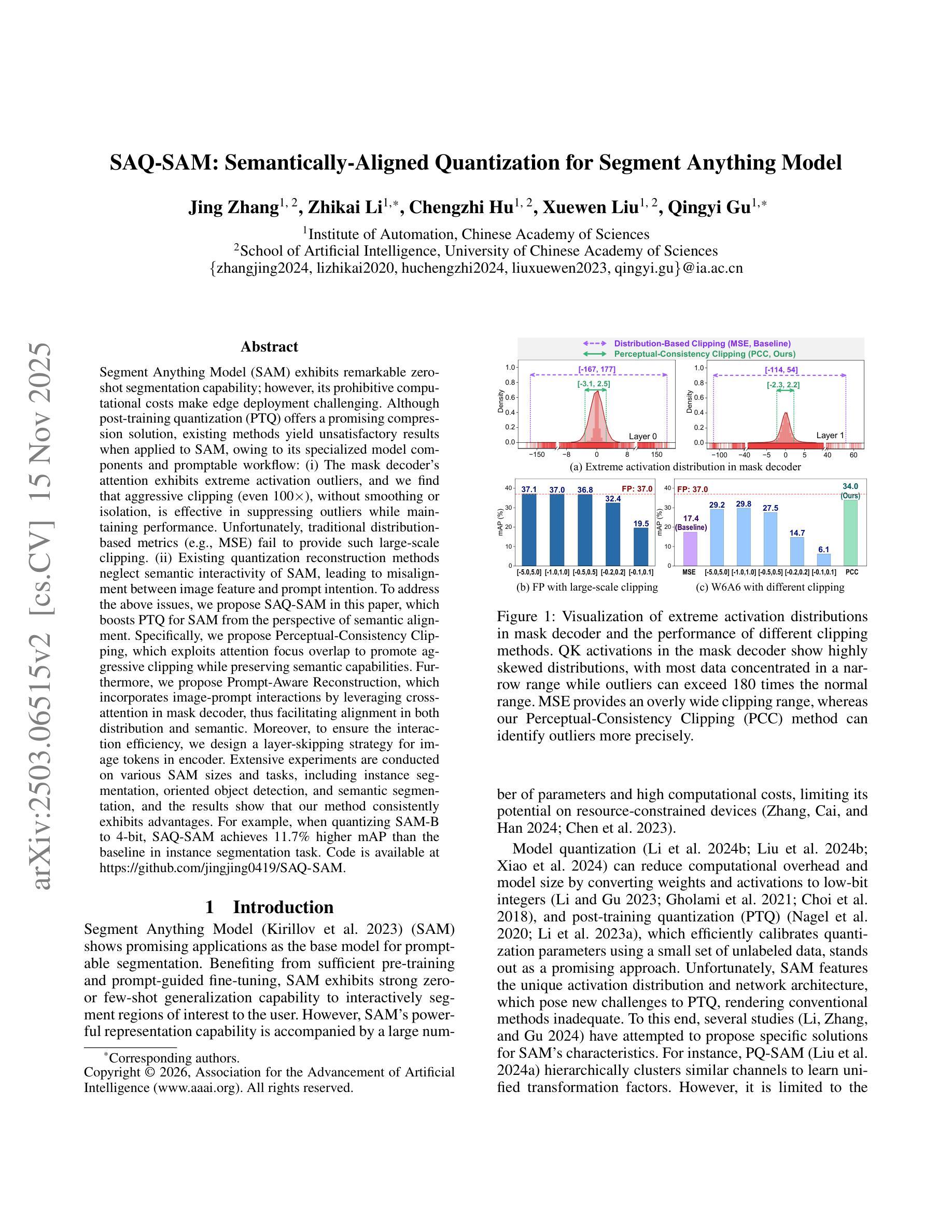 Segment Anything Model (SAM) exhibits remarkable zero-shot segmentation capability; however, its prohibitive computational costs make edge deployment challenging. Although post-training quantization (PTQ) offers a promising compression solution, existing methods yield unsatisfactory results when applied to SAM, owing to its specialized model components and promptable workflow: (i) The mask decoder’s attention exhibits extreme activation outliers, and we find that aggressive clipping (even 100x), without smoothing or isolation, is effective in suppressing outliers while maintaining performance. Unfortunately, traditional distribution-based metrics (e.g., MSE) fail to provide such large-scale clipping. (ii) Existing quantization reconstruction methods neglect semantic interactivity of SAM, leading to misalignment between image feature and prompt intention. To address the above issues, we propose SAQ-SAM in this paper, which boosts PTQ for SAM from the perspective of semantic alignment. Specifically, we propose Perceptual-Consistency Clipping, which exploits attention focus overlap to promote aggressive clipping while preserving semantic capabilities. Furthermore, we propose Prompt-Aware Reconstruction, which incorporates image-prompt interactions by leveraging cross-attention in mask decoder, thus facilitating alignment in both distribution and semantic. Moreover, to ensure the interaction efficiency, we design a layer-skipping strategy for image tokens in encoder. Extensive experiments are conducted on various SAM sizes and tasks, including instance segmentation, oriented object detection, and semantic segmentation, and the results show that our method consistently exhibits advantages. For example, when quantizing SAM-B to 4-bit, SAQ-SAM achieves 11.7% higher mAP than the baseline in instance segmentation task.