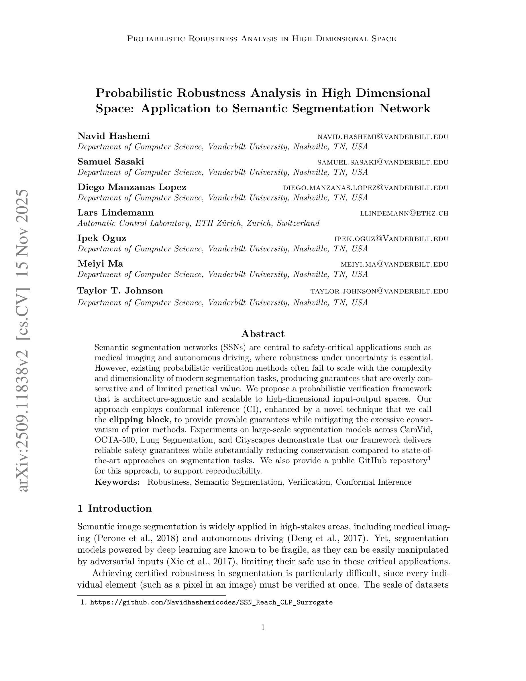 语义分割网络(SSNs)在医学影像和自动驾驶等安全关键领域应用扮演核心角色,这些领域需要处理不确定性下的稳健性。然而,现有的概率验证方法通常无法适应现代分割任务的复杂性和维数,提供的保证过于保守,实用价值有限。我们提出了一种概率验证框架,该框架不受架构限制,可扩展到高维输入输出空间。我们的方法采用形式化推断(CI),并结合我们称之为“裁剪块”的新技术,以提供可证明的保证,同时减轻先前方法的过度保守性。在CamVid、OCTA-500、肺分割和城市景观的大规模分割模型上的实验表明,我们的框架在分割任务上相较于最先进的方法提供了可靠的保证,同时显著减少了保守性。我们还为此方法提供了公共GitHub仓库(https://github.com/Navidhashemicodes/SSN_Reach_CLP_Surrogate),以支持复制和研究。