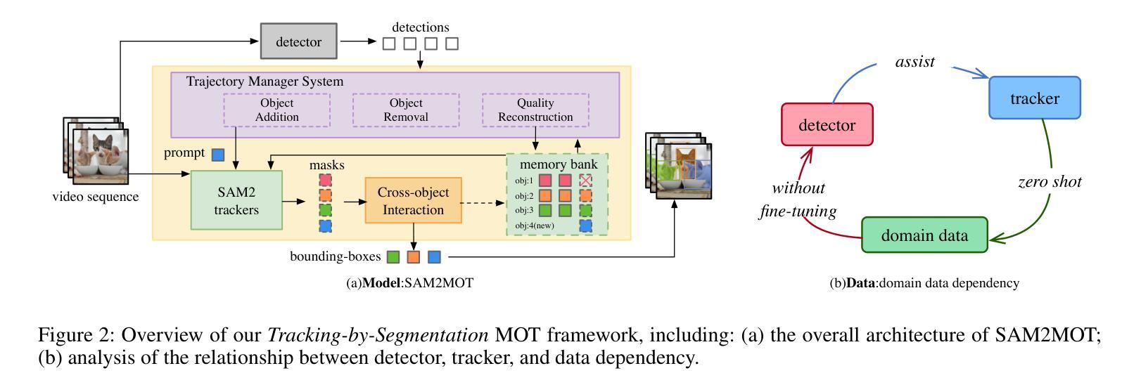 受Segment Anything 2的启发,它将图像分割技术泛化到视频领域,我们提出了SAM2MOT——一种用于多目标跟踪的新型分割驱动范式,它打破了传统的检测关联框架。与以前将分割视为辅助信息的方法不同,SAM2MOT将其置于跟踪过程的核心,系统解决误报和遮挡等挑战。它在主要的MOT基准测试上的有效性已经得到了充分的验证。此外,SAM2MOT将预训练检测器、预训练分割器与跟踪逻辑集成到一个无需微调即可进行零点击MOT的系统,这极大地减少了其对标记数据的依赖,为从任务特定解决方案向通用系统过渡的MOT研究铺平了道路。在DanceTrack、UAVDT和BDD100K上的实验显示其处于领先水平。值得注意的是,SAM2MOT在DanceTrack上的HOTA高出+2.1,+IDF高出+4.5,突显其在MOT中的有效性。代码可在https://github.com/TripleJoy/SAM2MOT找到。
