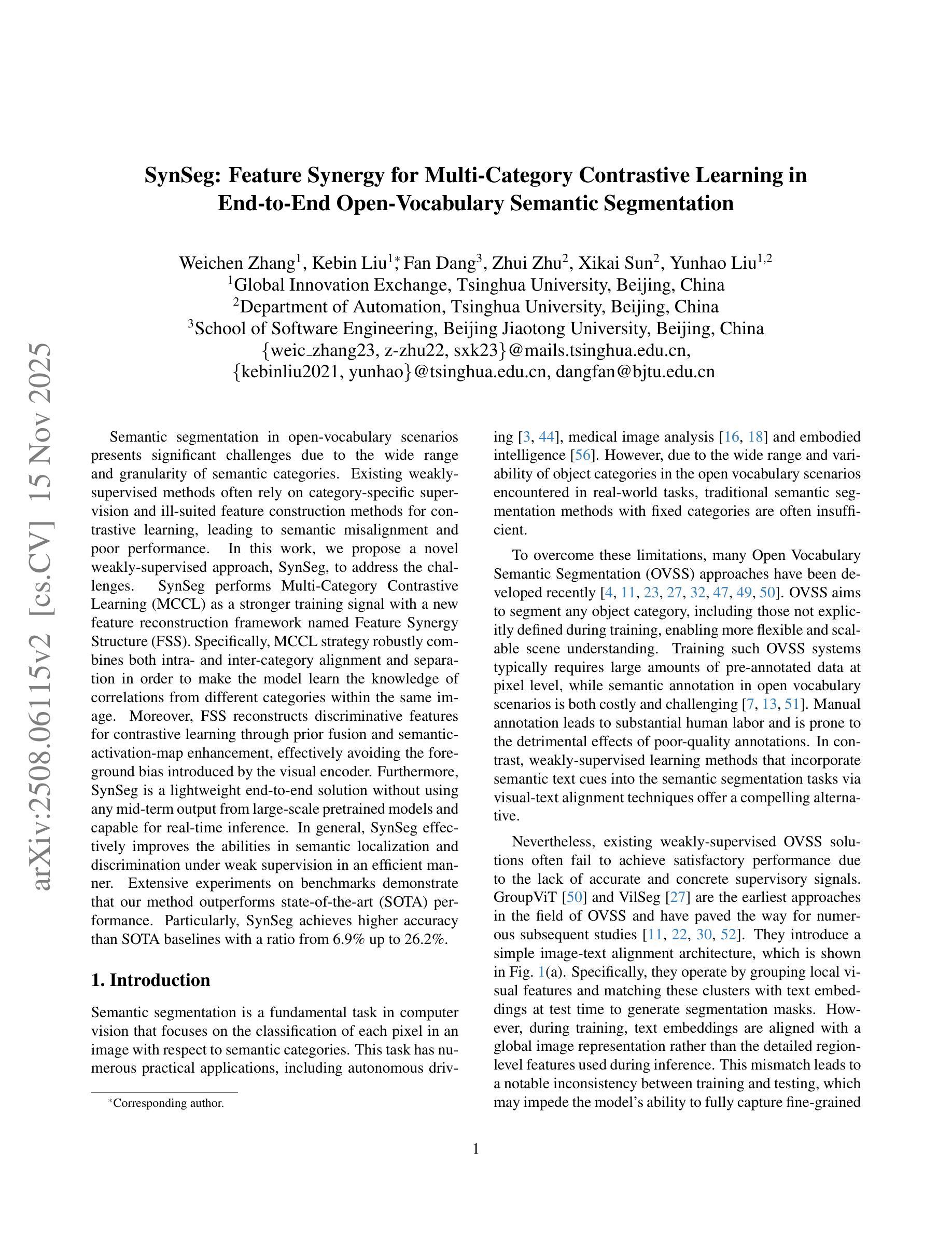 在开放词汇场景中,语义分割面临着广泛的语义类别和粒度所带来的巨大挑战。现有的弱监督方法通常依赖于特定类别的监督和不适合对比学习的特征构建方法,导致语义不匹配和性能不佳。在这项工作中,我们提出了一种新型的弱监督方法SynSeg,以应对这些挑战。SynSeg执行多类别对比学习(MCCL)作为更强的训练信号,并引入一个新的特征重建框架,称为特征协同结构(FSS)。具体来说,MCCL策略稳健地将同一图像内不同类别之间的类别内和类别间对齐和分离结合起来,使模型学习不同类别之间的关联知识。此外,FSS通过先验融合和语义激活图增强,重建了用于对比学习的判别特征,有效地避免了视觉编码器引入的前景偏见。此外,SynSeg是一种轻量级的端到端解决方案,无需使用大规模预训练模型的任何中期输出,适用于实时推理。总的来说,SynSeg在弱监督情况下有效地提高了语义定位和鉴别的能力。在基准测试上的大量实验表明,我们的方法超过了最新技术(SOTA)的性能。特别是,SynSeg的准确率高于SOTA基准线,比例从6.9%到26.2%。