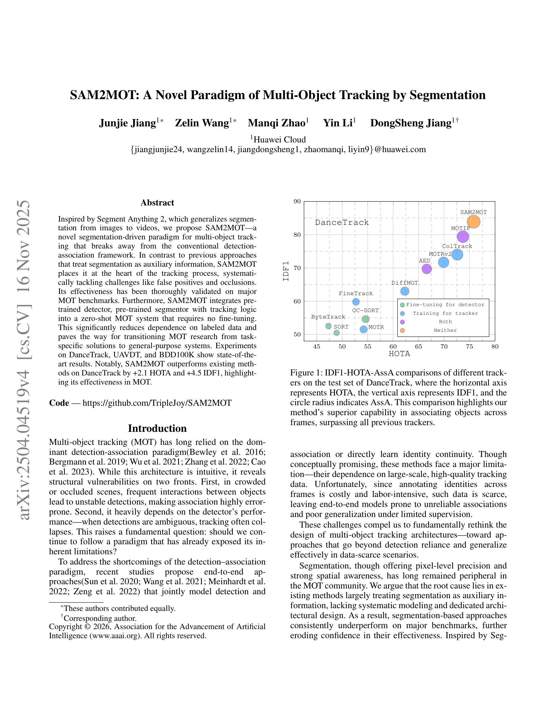 基于Segment Anything 2对图像分割的通用框架启发,提出SAM2MOT这一新颖的多目标跟踪分割驱动范式,突破传统检测关联框架的局限。SAM2MOT将分割置于跟踪过程的核心,有效应对误报和遮挡等挑战。其在主要多目标跟踪基准测试中得到了验证。此外,SAM2MOT集成了预训练检测器、预训练分割器和跟踪逻辑,构建了一个无需微调即能适应多种任务的零样本多目标跟踪系统,减少了标签数据的依赖,为从任务特定解决方案向通用系统的过渡铺平了道路。在DanceTrack、UAVDT和BDD100K上的实验显示其表现卓越。代码已公开在GitHub上。