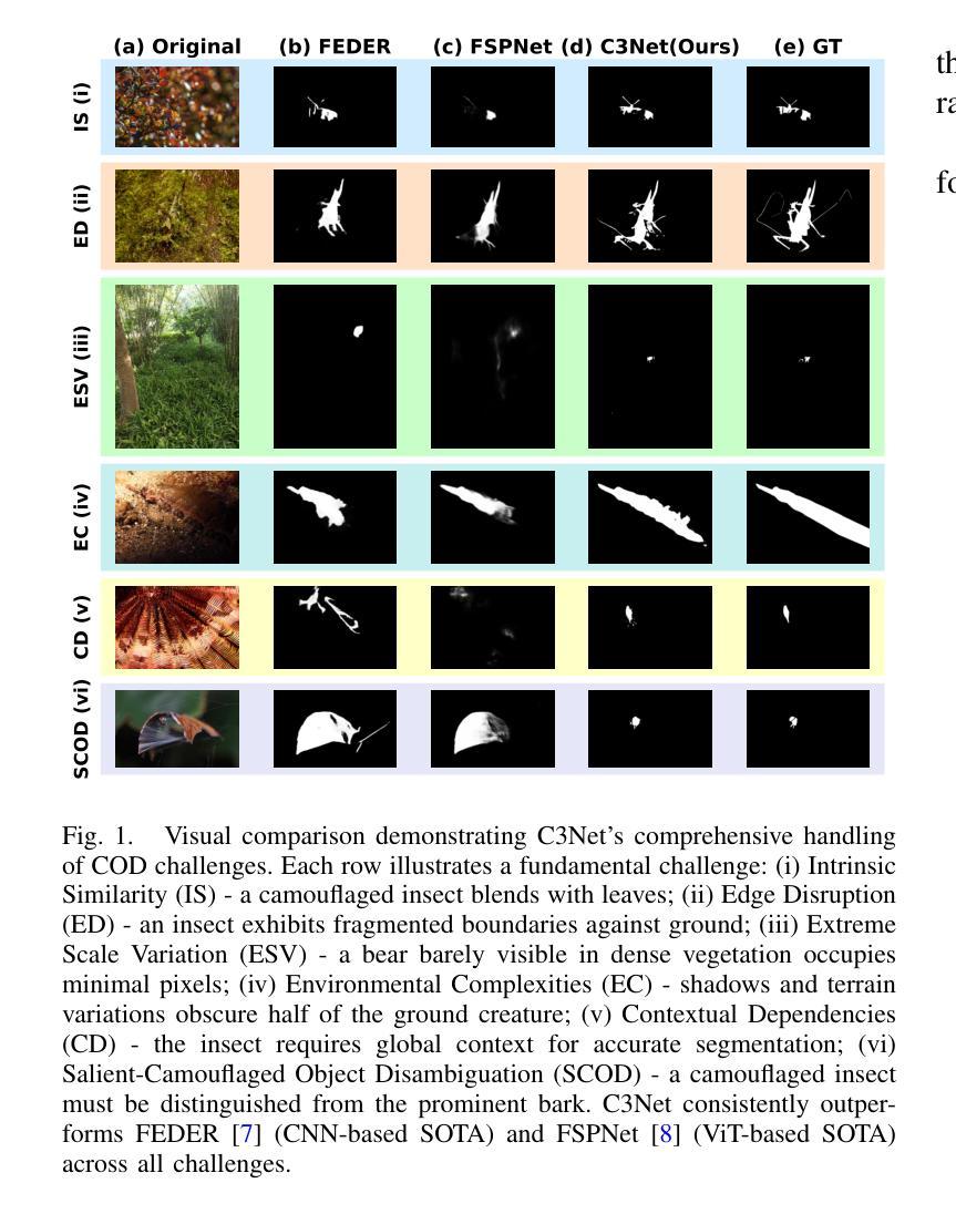 Summary:伪装目标检测旨在识别与周围环境通过颜色、纹理和图案无缝融合的目标。传统分割方法和现代基础模型在伪装目标检测方面存在挑战。本文提出六大挑战,并设计C3Net解决所有挑战,包括边缘优化路径和环境定位路径等创新架构,实现了高效、准确的伪装目标检测。模型性能优异,并在三个数据集上实现最新状态表现。