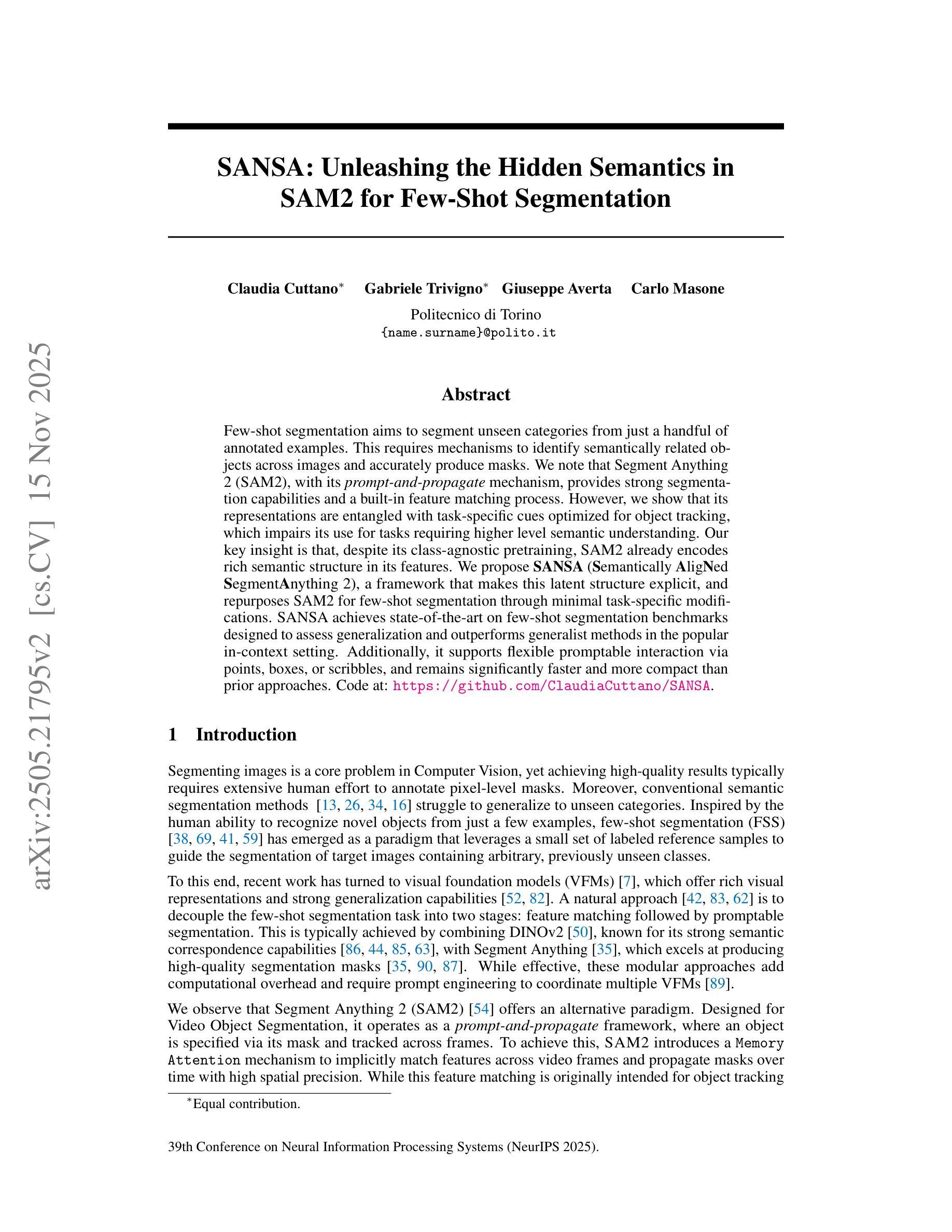小样本分割(Few-shot segmentation)旨在从少量标注的样本中对未见过的目标类别进行分割。这需要能够在图像中识别语义相关对象并准确生成分割掩模的机制。我们注意到,借助提示和传播机制(prompt-and-propagate mechanism),Segment Anything 2(SAM2)提供了强大的分割能力和内置的特征匹配过程。然而,我们展示其表示与针对对象跟踪优化的特定任务线索交织在一起,这损害其用于需要更高层次语义理解的任务的实用性。我们的关键见解是,尽管它采用了类无关预训练(class-agnostic pretraining),但SAM2的特征中已经编码了丰富的语义结构。我们提出SANSA(语义对齐分段任何东西2),它通过最轻微的特定任务修改使这种潜在结构明确化,并重新利用SAM2进行小样本分割。SANSA在专门设计用于评估泛化的少样本分割基准测试中实现了最先进的性能,在流行上下文设置中的通用方法表现优异,支持通过点、框或涂鸦进行各种提示灵活交互,并且相比于以前的方法仍然显著更快、更紧凑。代码可在https://github.com/ClaudiaCuttano/SANSA找到。